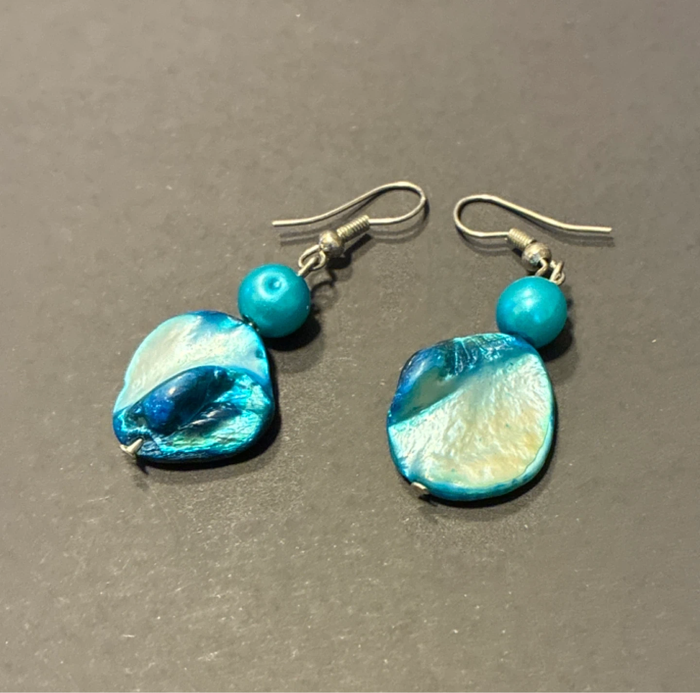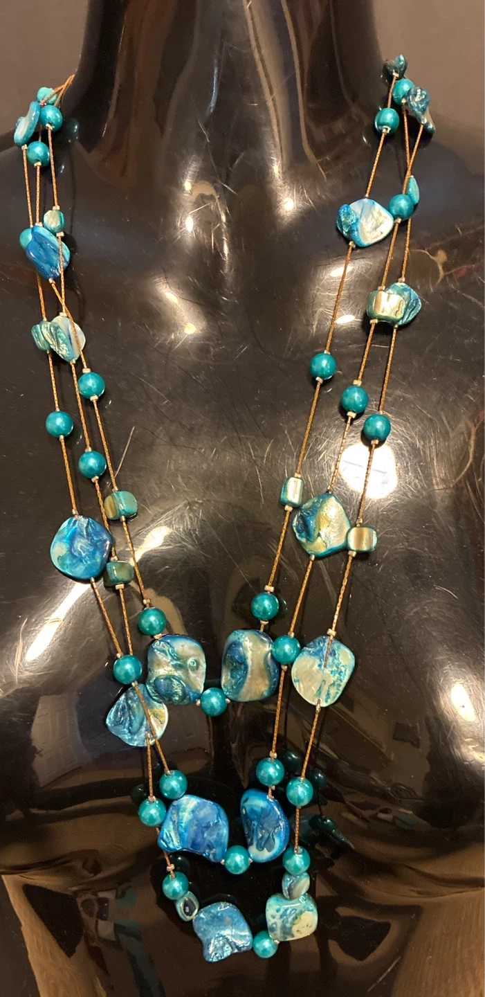 A pretty multi-strand necklace paired with matching dangle earrings. Features iridescent shell pieces and turquoise-coloured beads. Shell and bead materials.