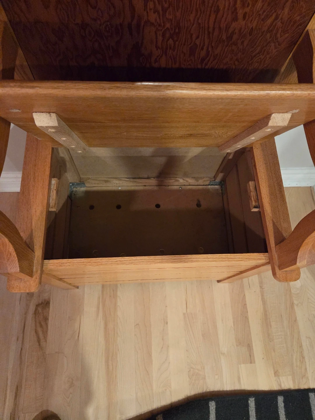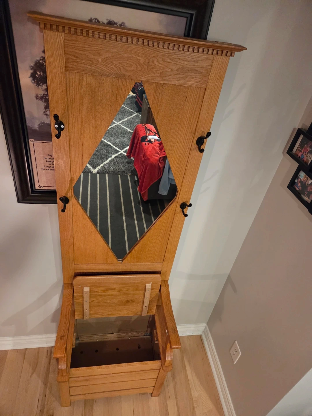 This hall tree is made of solid oak and features a diamond-shaped mirror. It includes multiple coat hooks and a storage bench with a lift-top seat. It's a great piece for an entryway or mudroom!