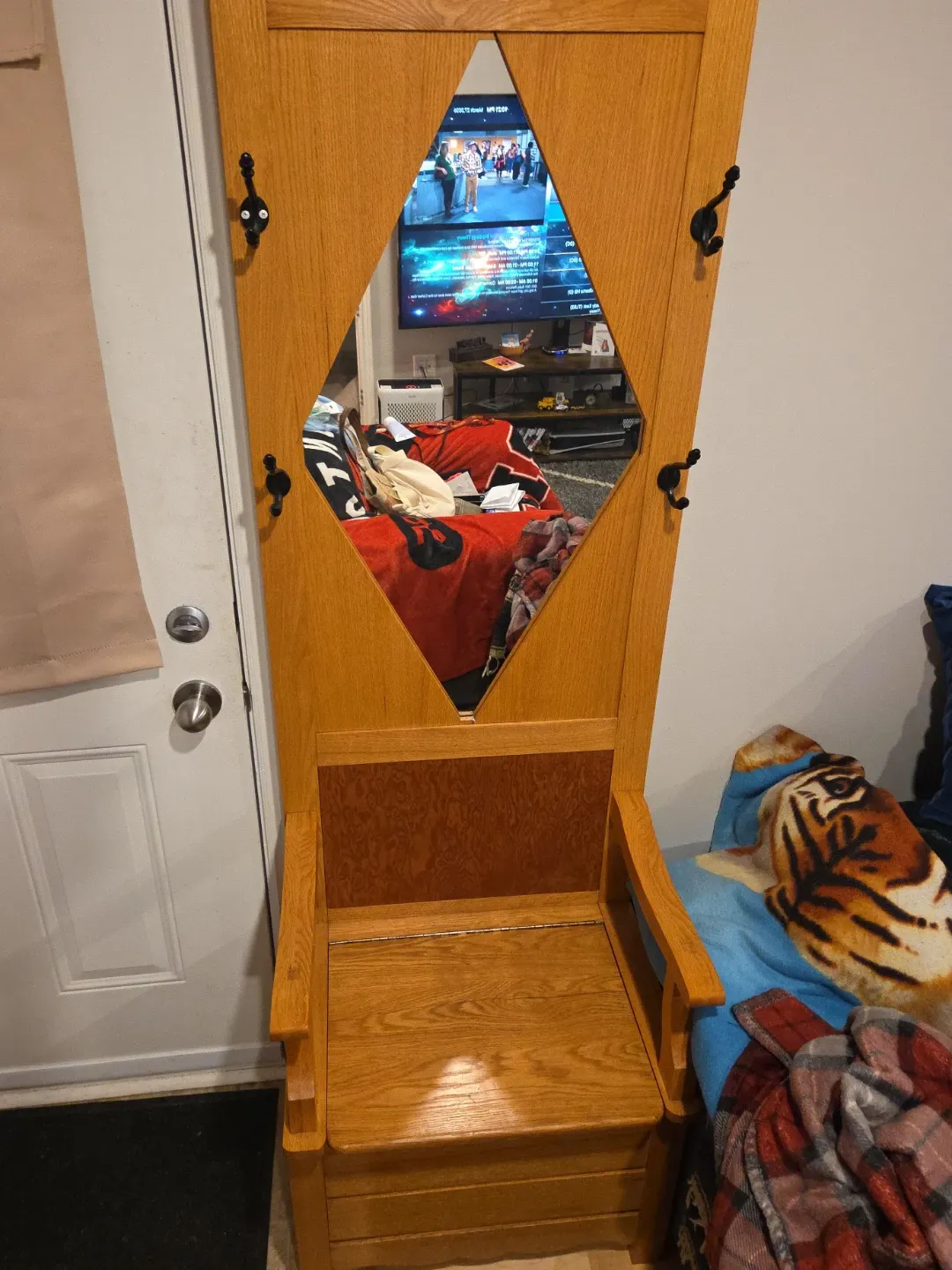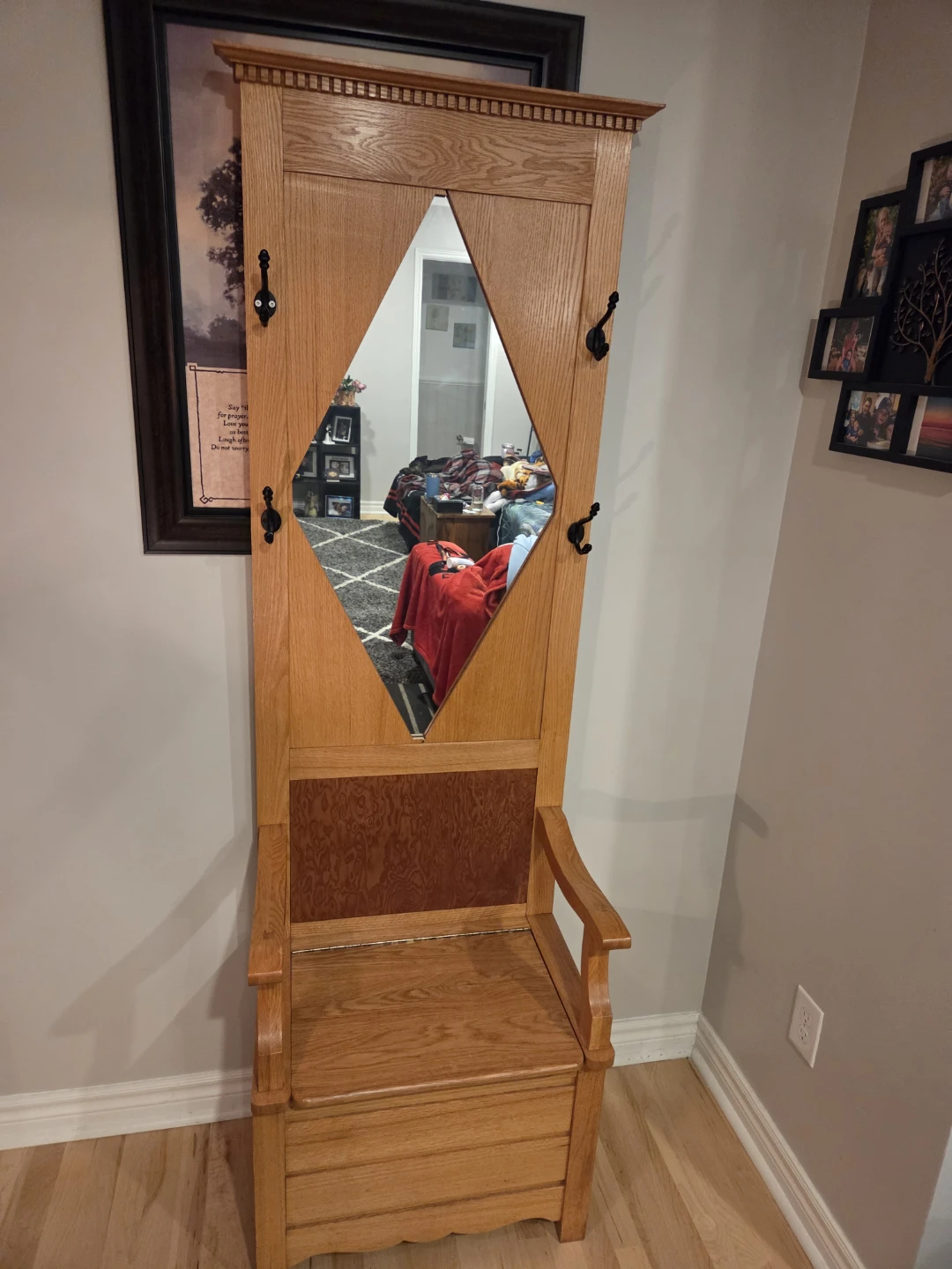 This hall tree is made of solid oak and features a diamond-shaped mirror. It includes multiple coat hooks and a storage bench with a lift-top seat. It's a great piece for an entryway or mudroom!