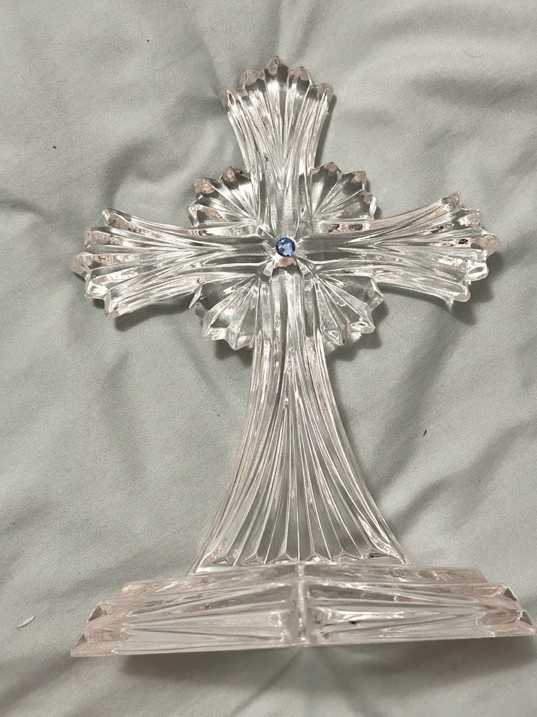 Beautiful clear crystal cross decoration. Features a delicate blue stone in the center. It's a lovely accent piece for any shelf or table!