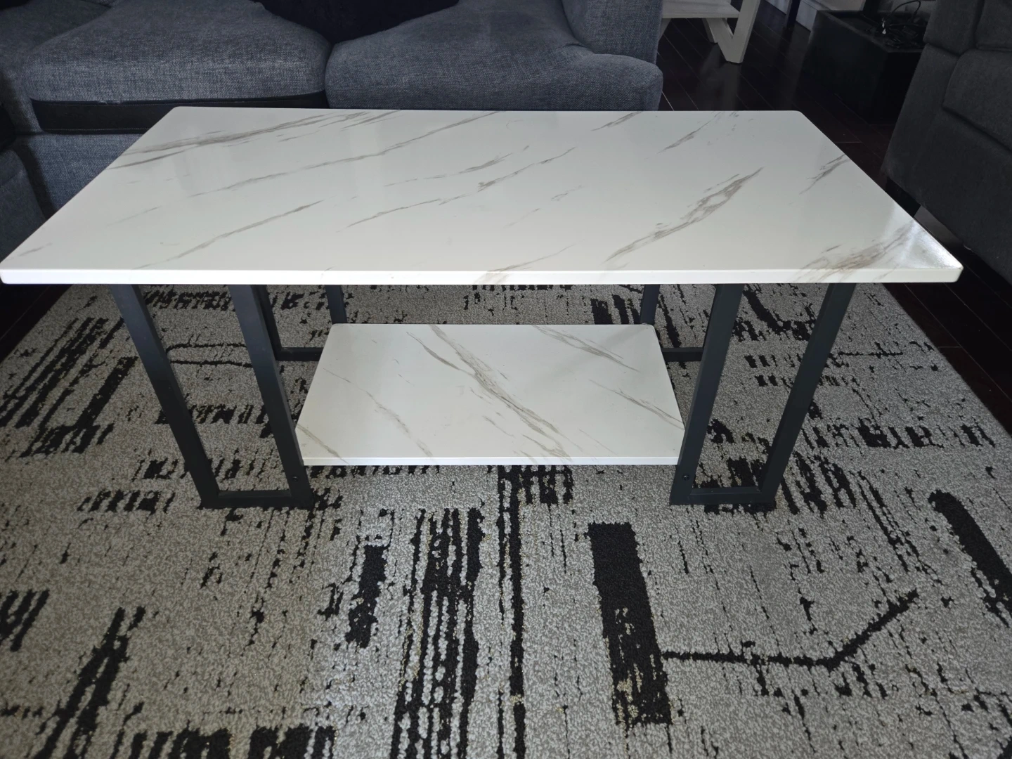 This coffee table features a white marble-look top and a lower shelf for storage. Its modern design includes sturdy black metal legs. This table would be useful in a living room or den!