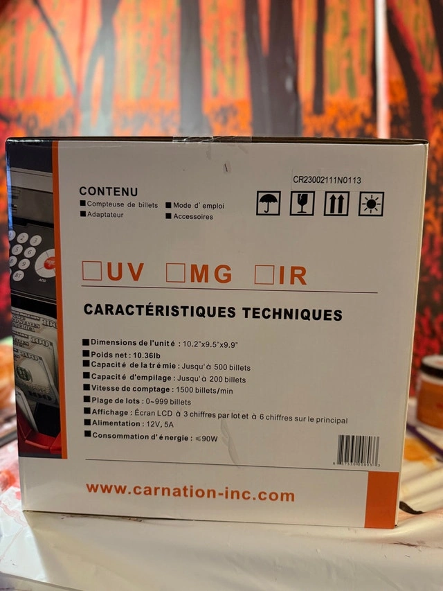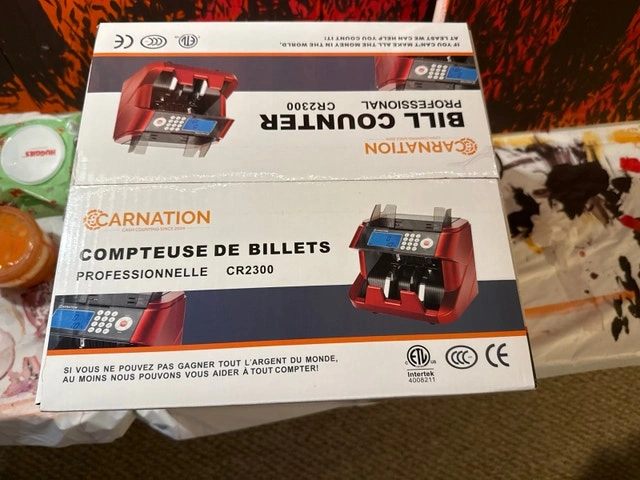 I have 2 brand-new, sealed Carnation CR2300 Professional bill counters for sale. You can buy both for $279, or $159 each. They feature UV, MG, and IR counterfeit detection, count up to 1500 bills per minute, and have a hopper capacity of 500 bills with a 200-bill stacker. Each unit includes an adapter, manual, and accessories. Please note these machines count the number of bills, not the total value. Pickup is in Aurora. Payment accepted is cash or e-transfer upon pickup.