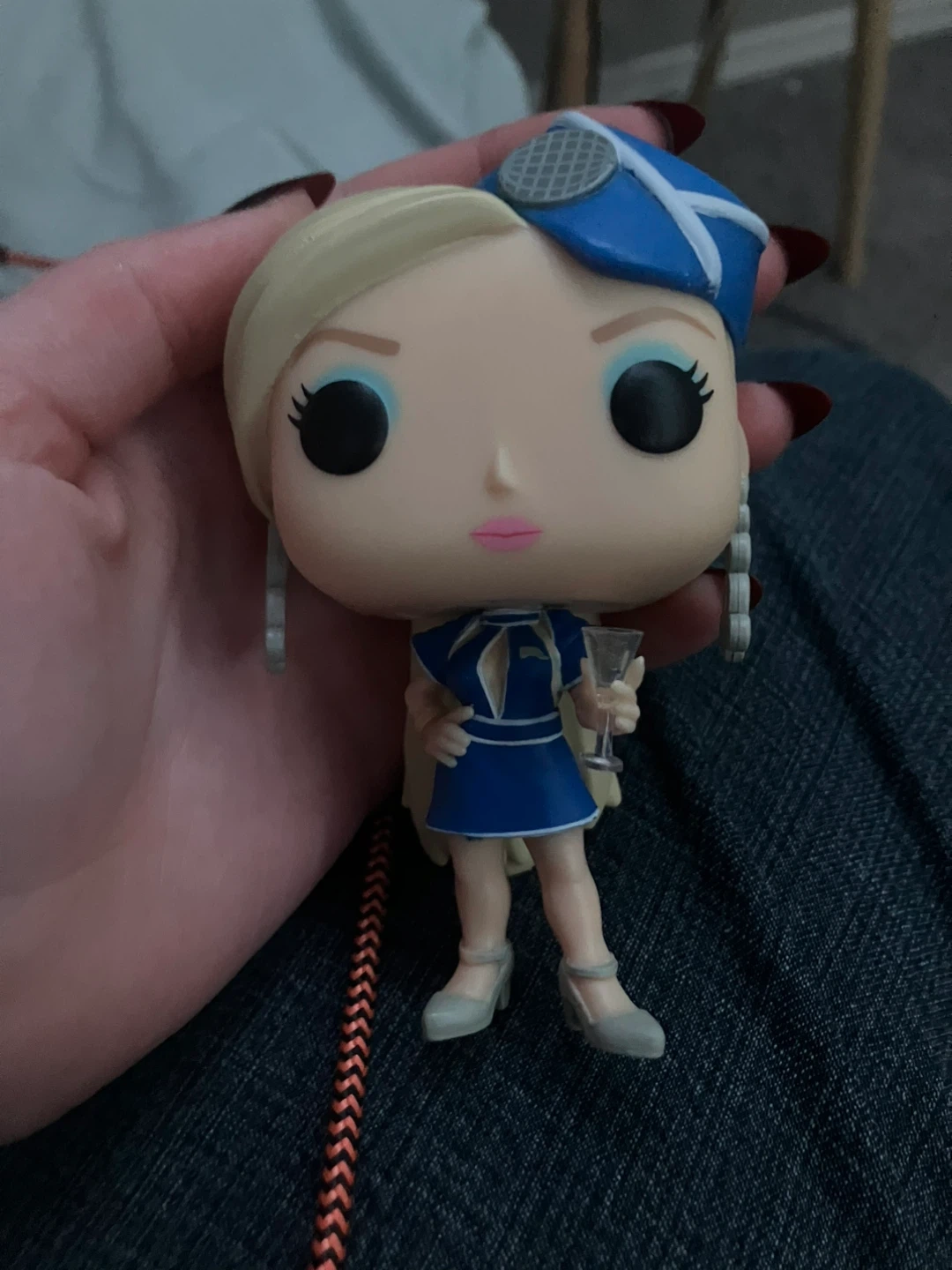 This is a Funko Pop! Of Brittney spears figure with a blue dress and blonde hair. It's holding a champagne glass and wearing a blue hat with a checkered design. The figure has grey shoes and grey earrings.