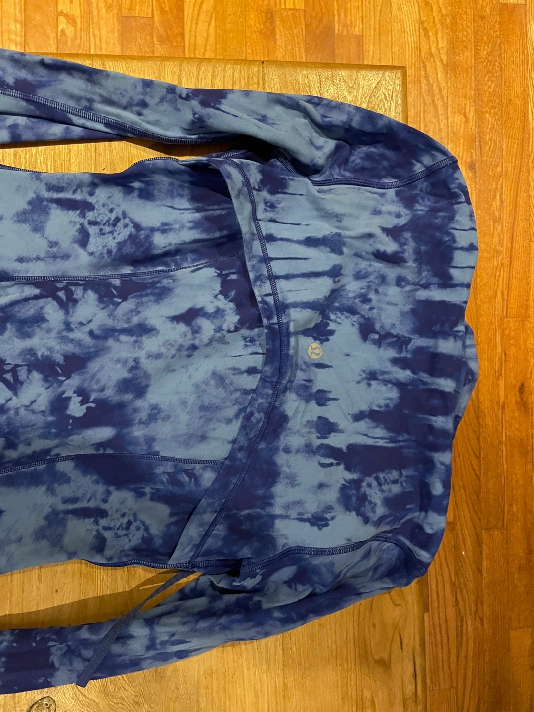 Lululemon zip-up jacket comes in a blue tie-dye pattern. The body is 80% nylon and 20% Lycra elastane, with a 56% polyester, 33% Coolmax polyester, and 11% Lycra elastane lining.