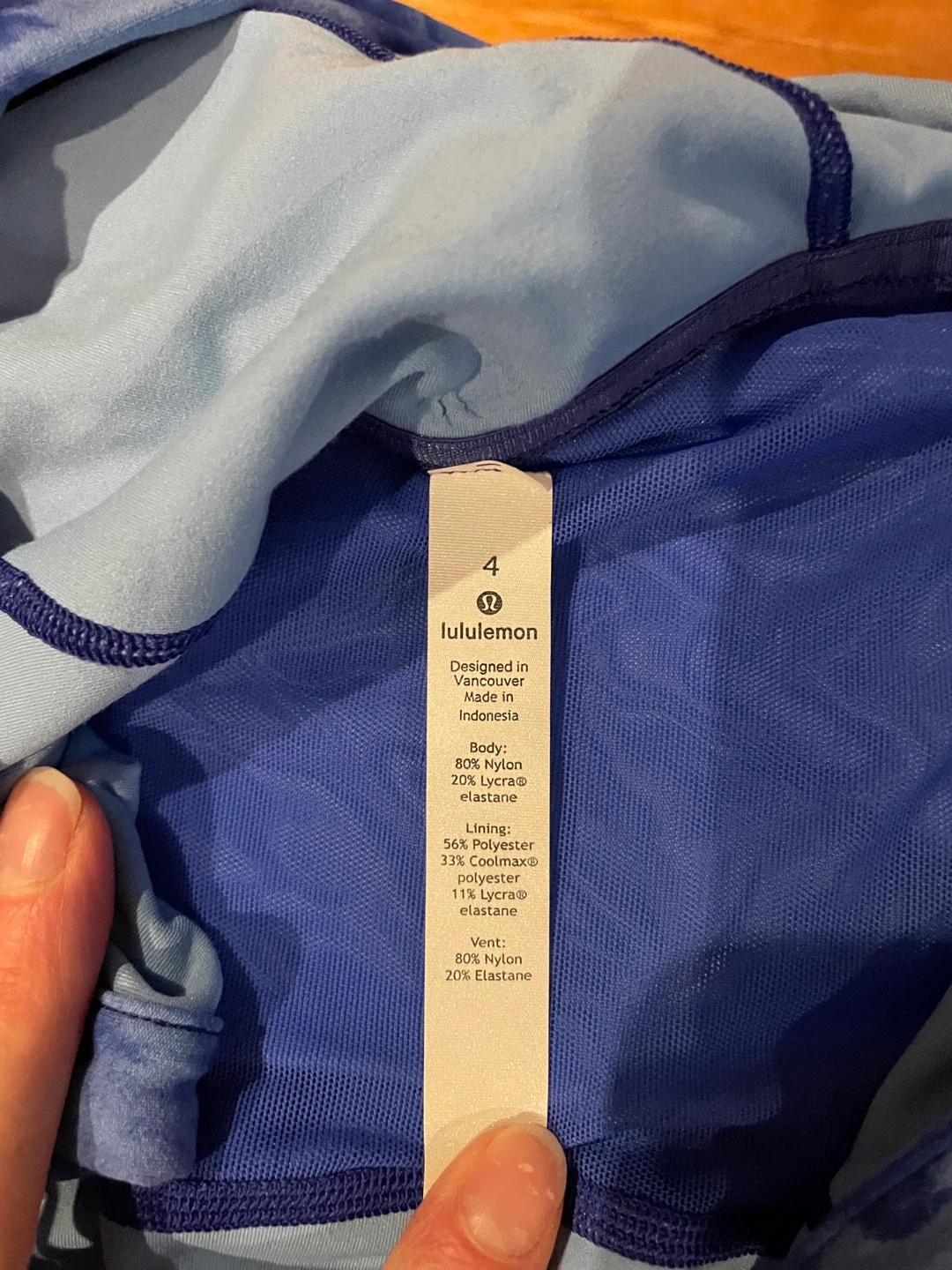 Lululemon zip-up jacket comes in a blue tie-dye pattern. The body is 80% nylon and 20% Lycra elastane, with a 56% polyester, 33% Coolmax polyester, and 11% Lycra elastane lining.