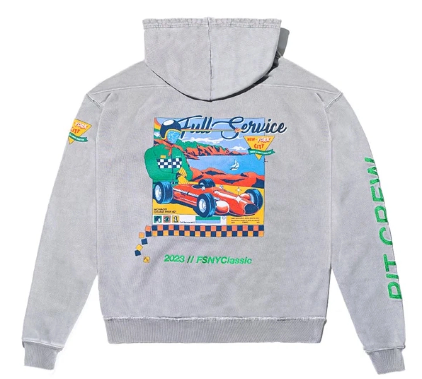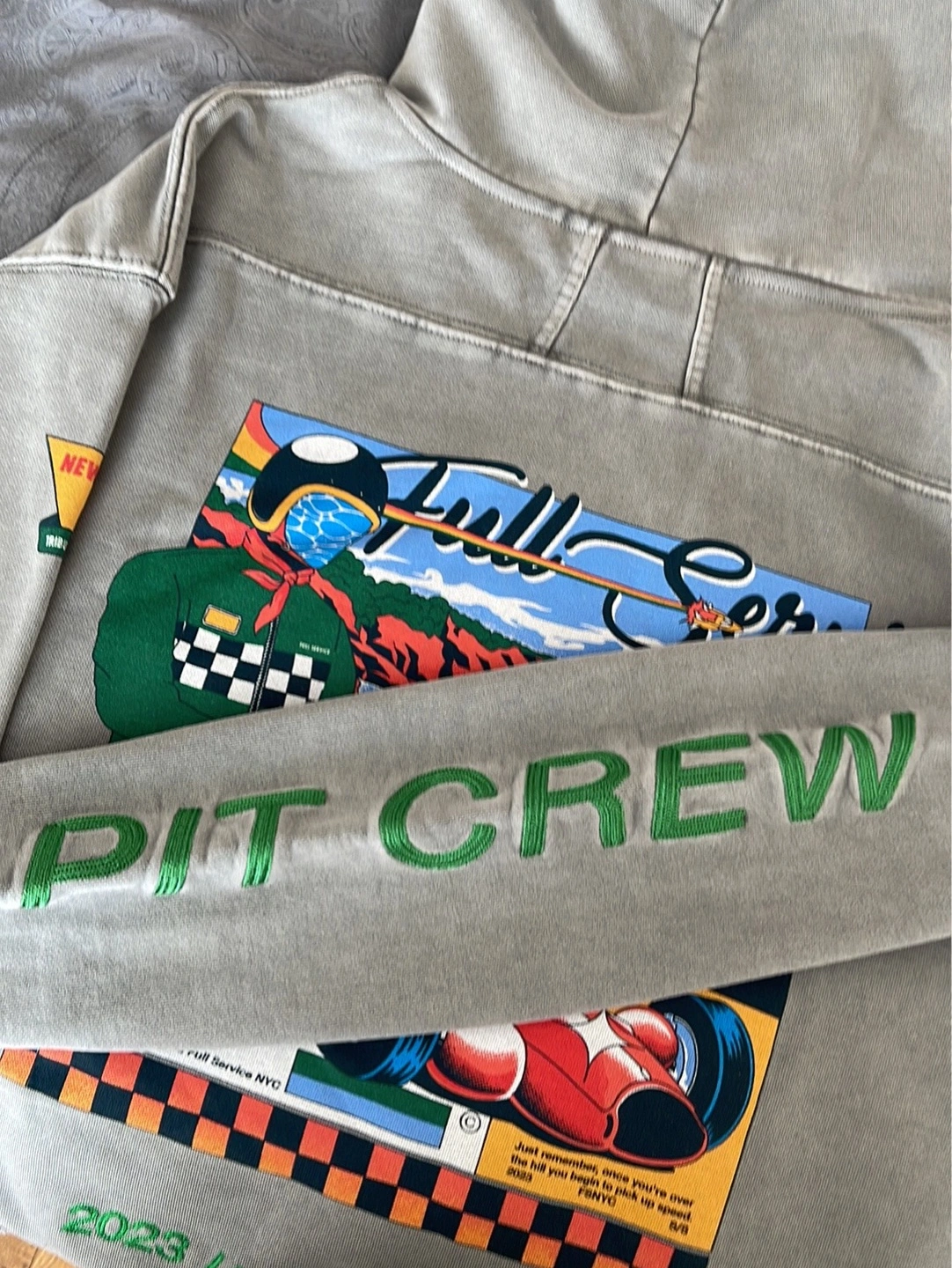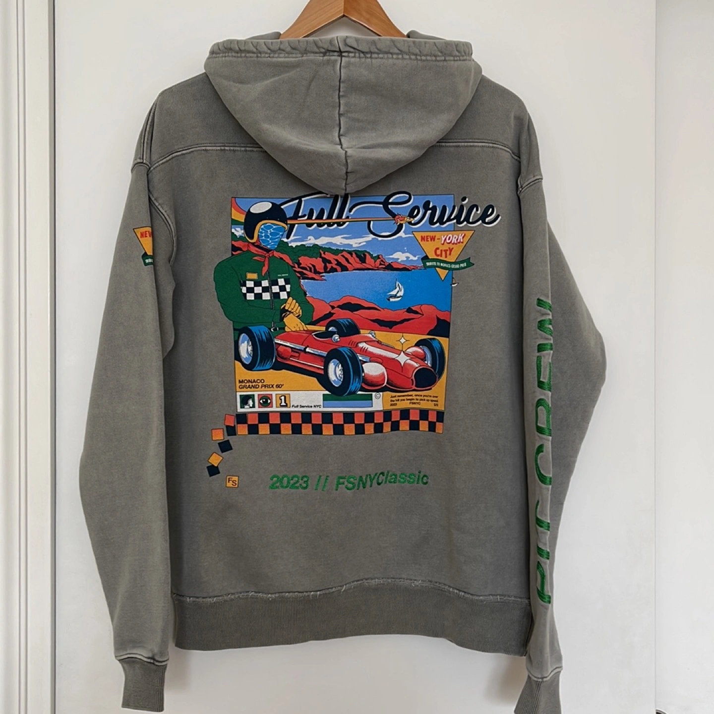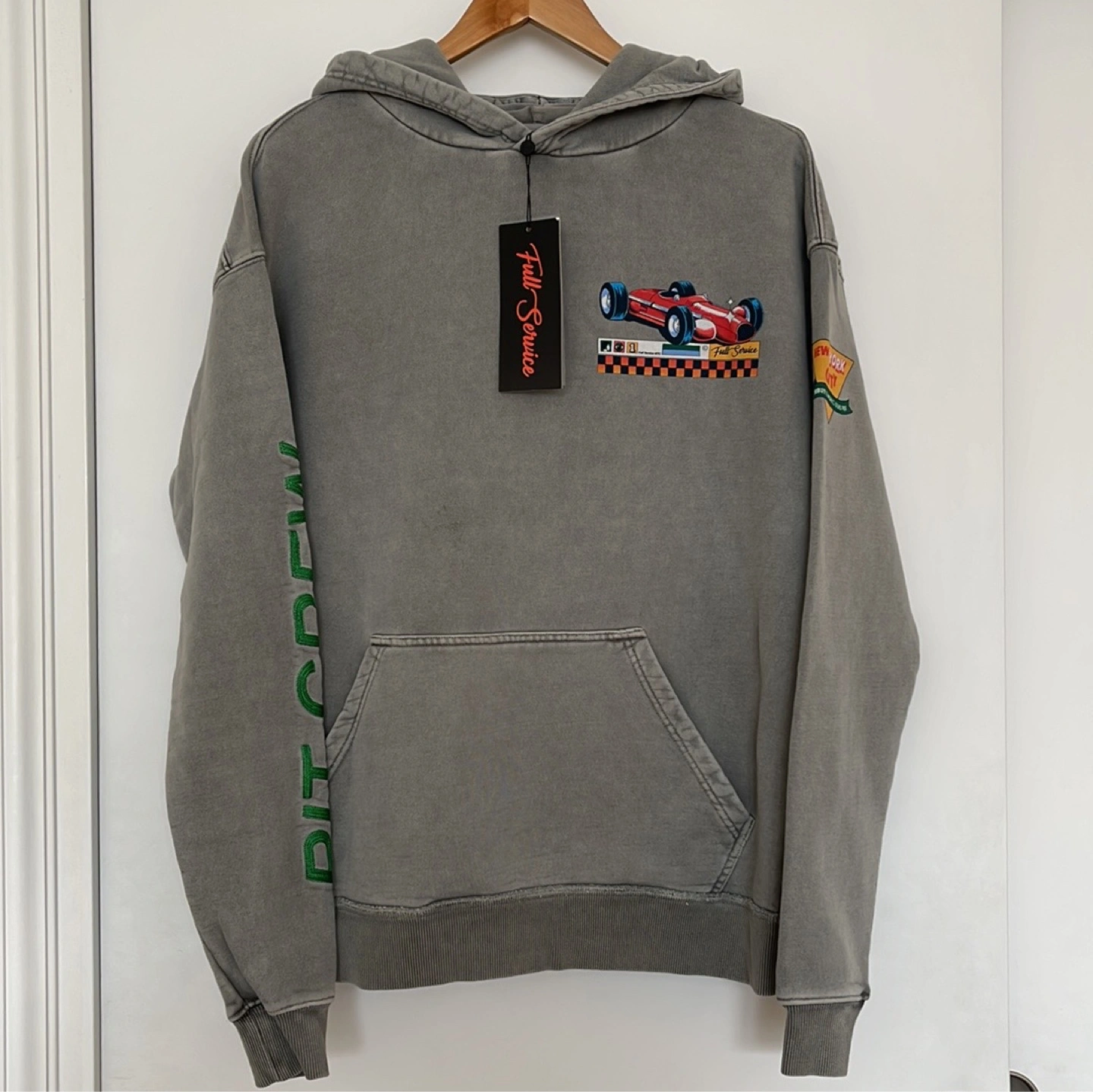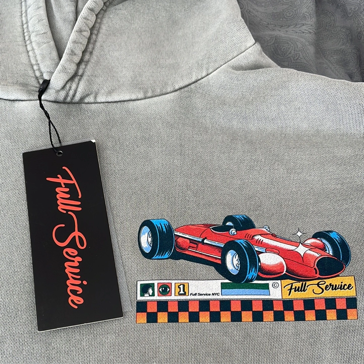 High end quality - heavyweight Selling a gray hoodie from Full Service NYC. It features a cool race car design on the front and a larger graphic on the back. The sleeves also have 'PIT CREW' printed on them. Great for fans of vintage racing!