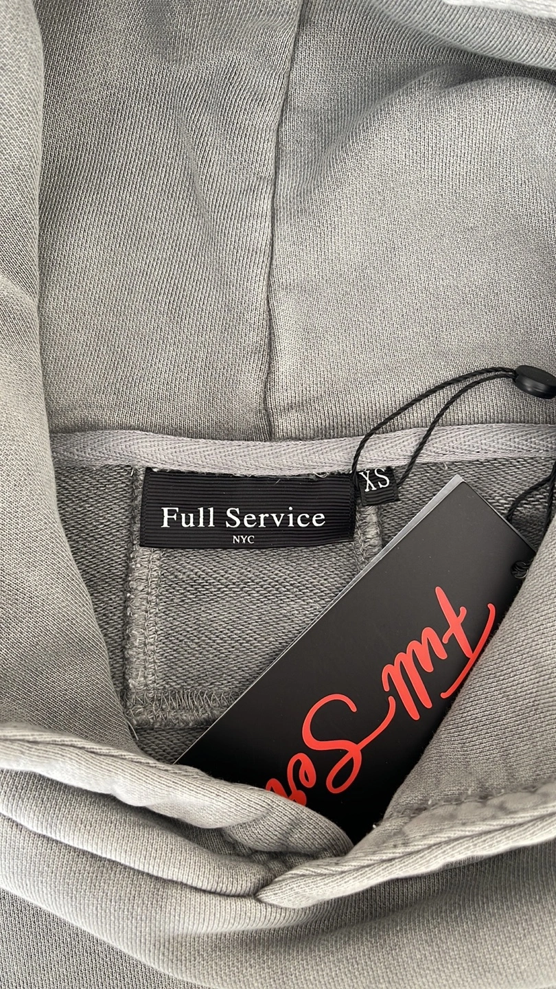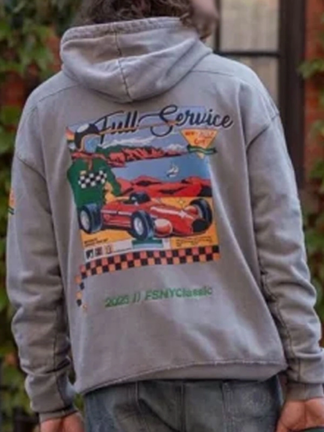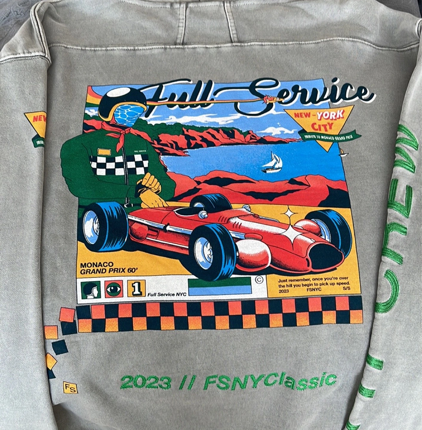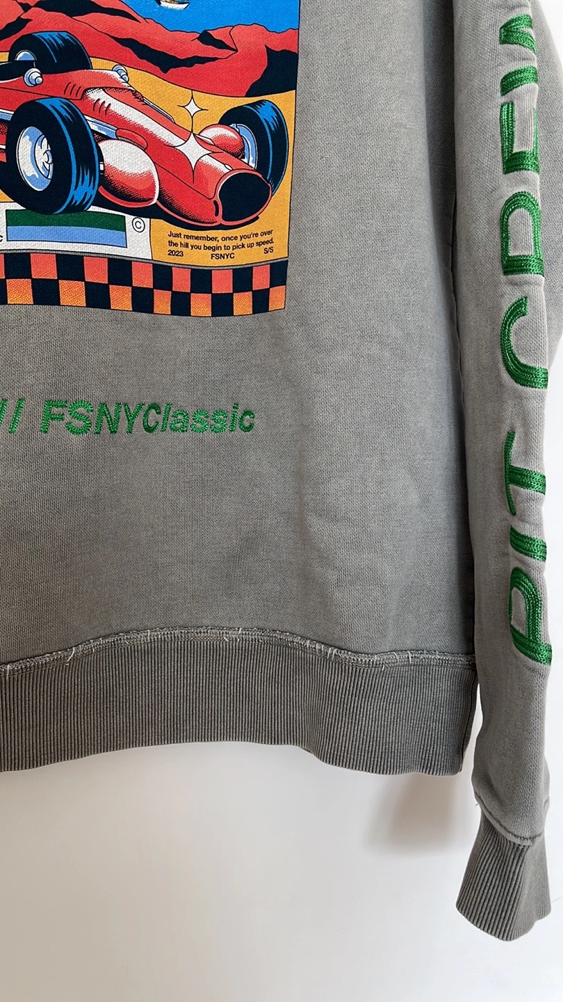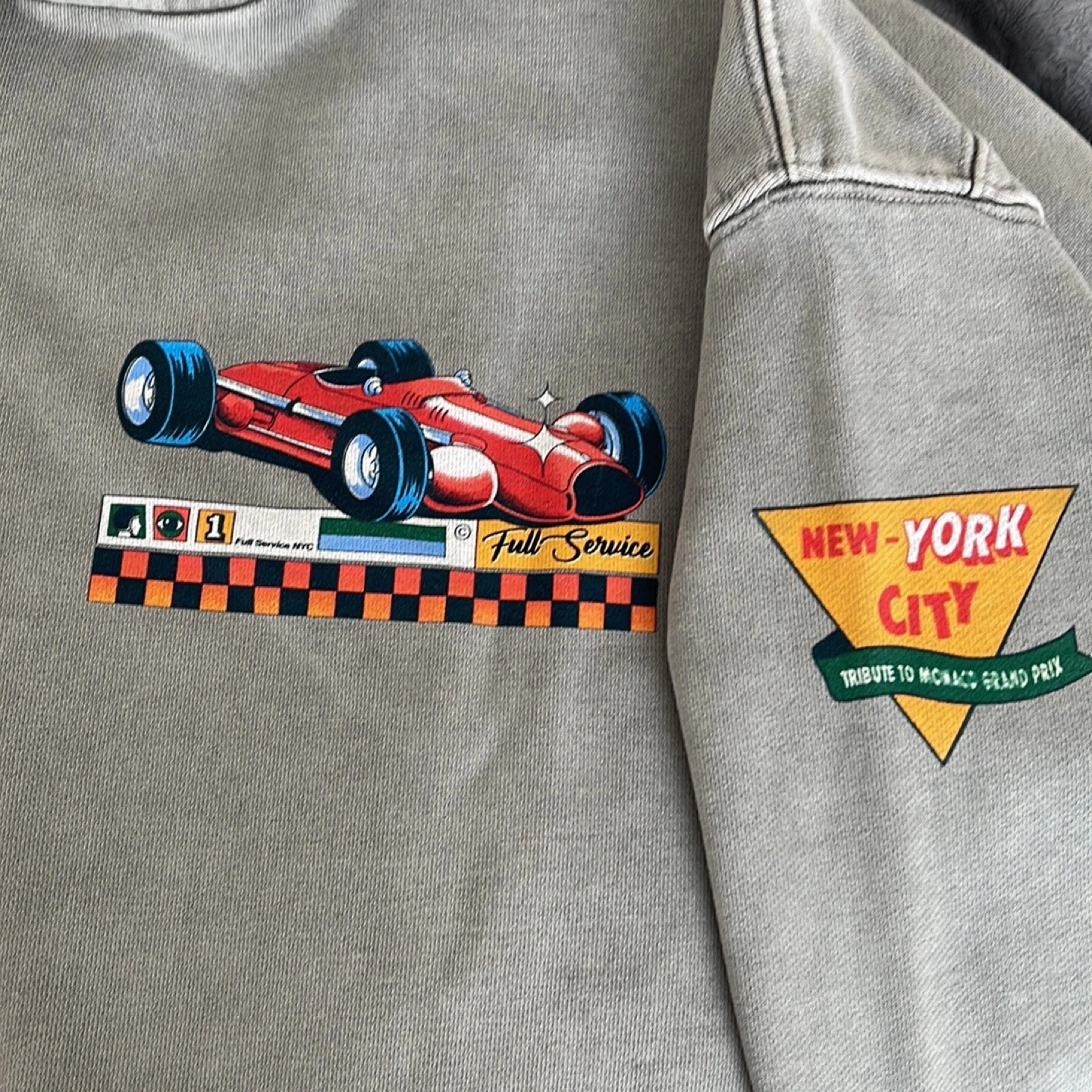 High end quality - heavyweight Selling a gray hoodie from Full Service NYC. It features a cool race car design on the front and a larger graphic on the back. The sleeves also have 'PIT CREW' printed on them. Great for fans of vintage racing!