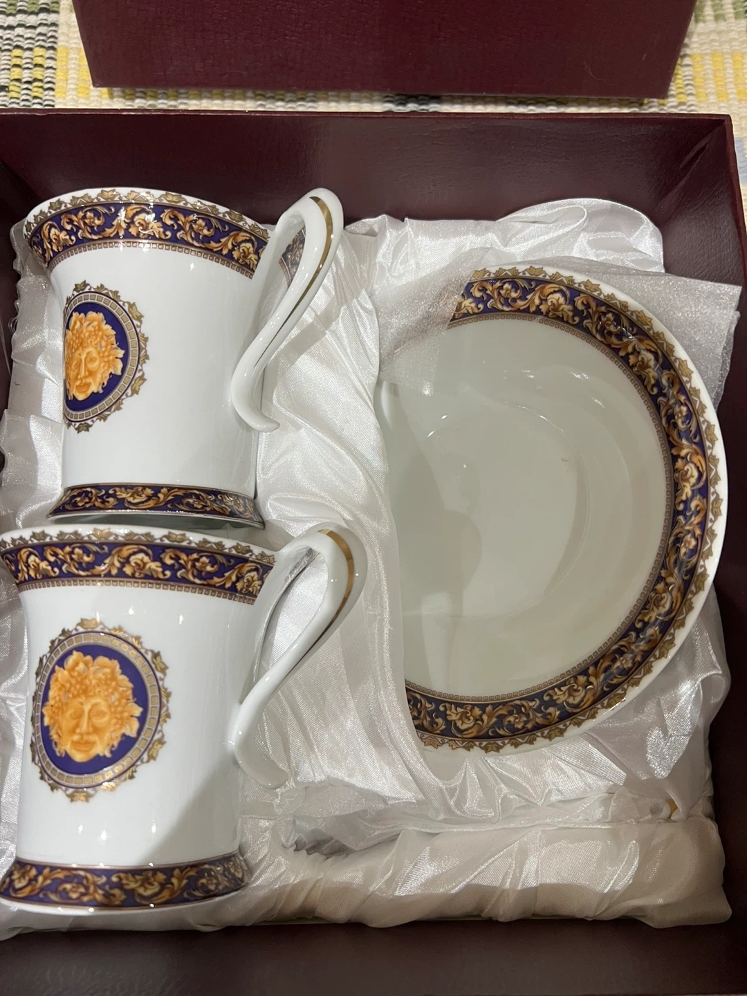 Set of two Adeline Fine Porcelain tea cups and saucers, each with decorative gold and blue accents. Includes two matching spoons. 100% handmade collector's piece crafted by master sculptors. Perfect for a sophisticated tea time experience!