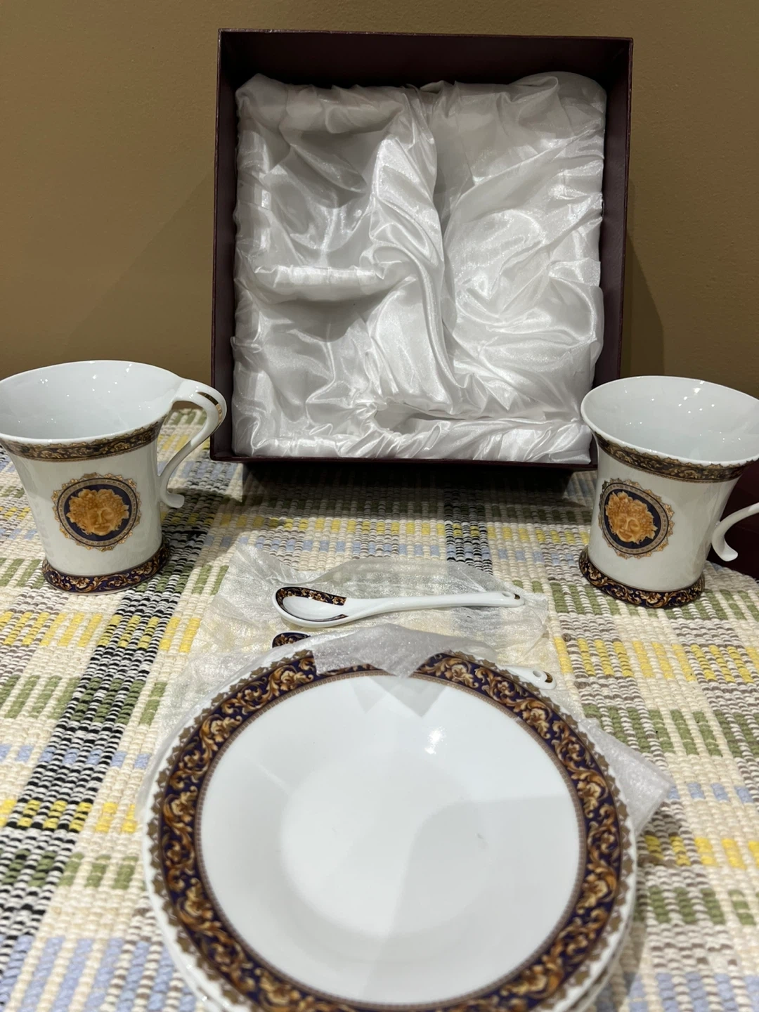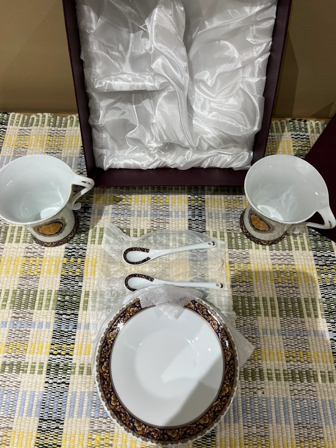 Set of two Adeline Fine Porcelain tea cups and saucers, each with decorative gold and blue accents. Includes two matching spoons. 100% handmade collector's piece crafted by master sculptors. Perfect for a sophisticated tea time experience!