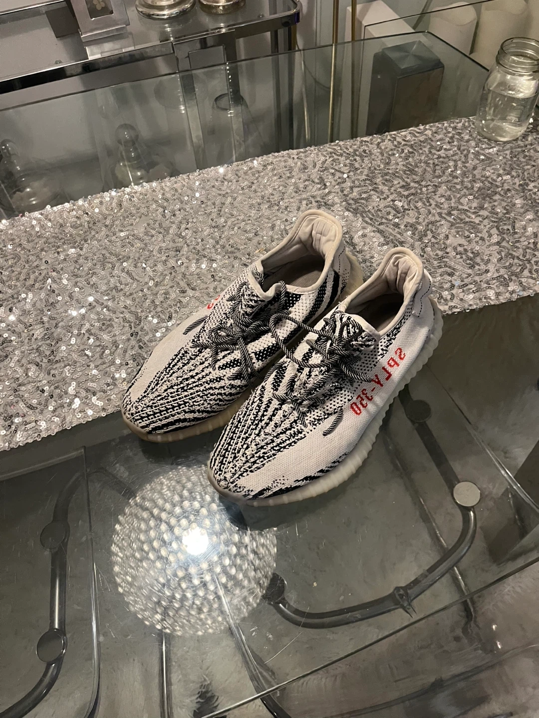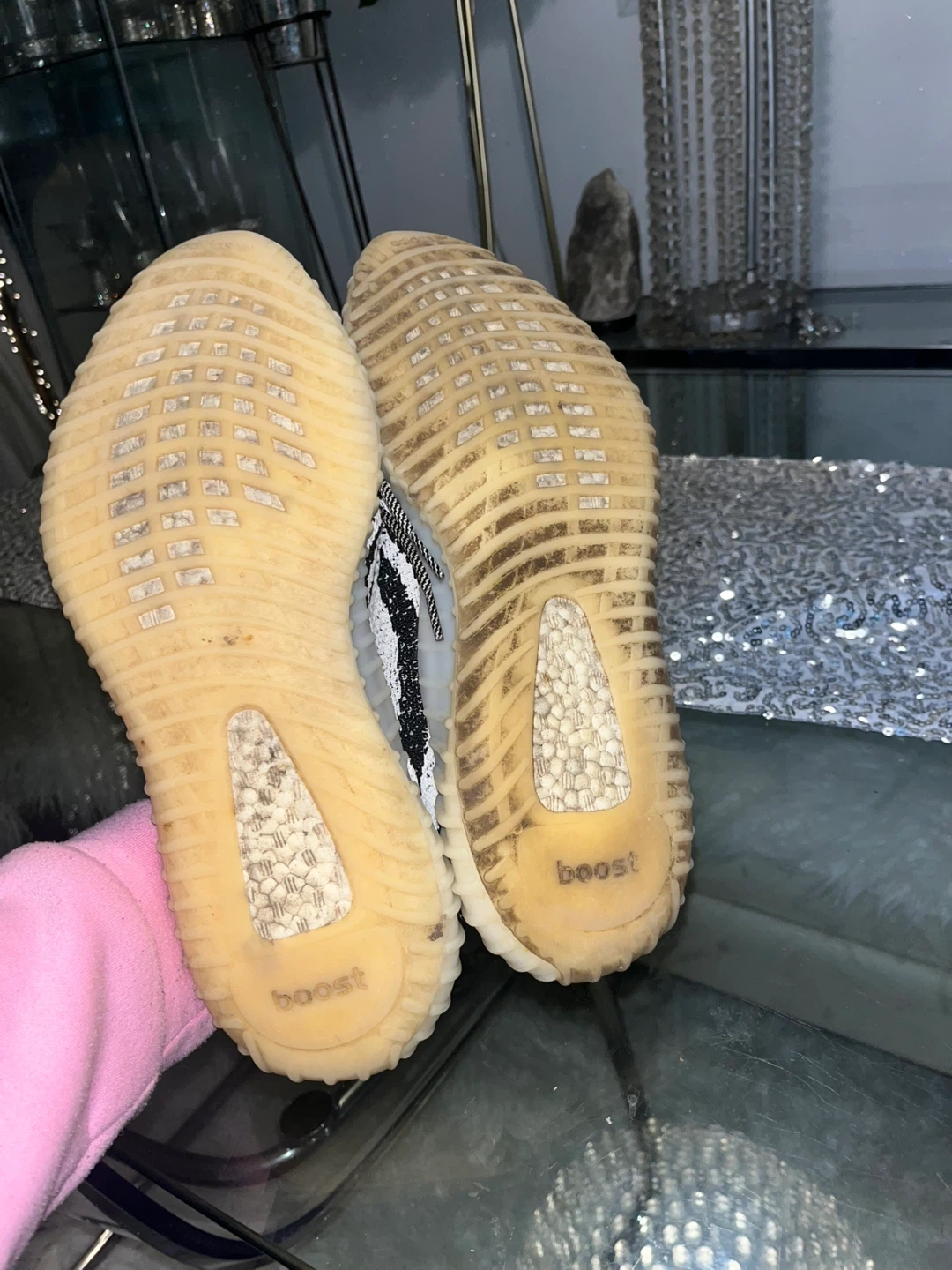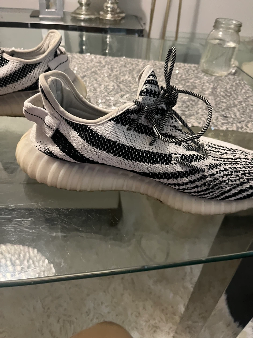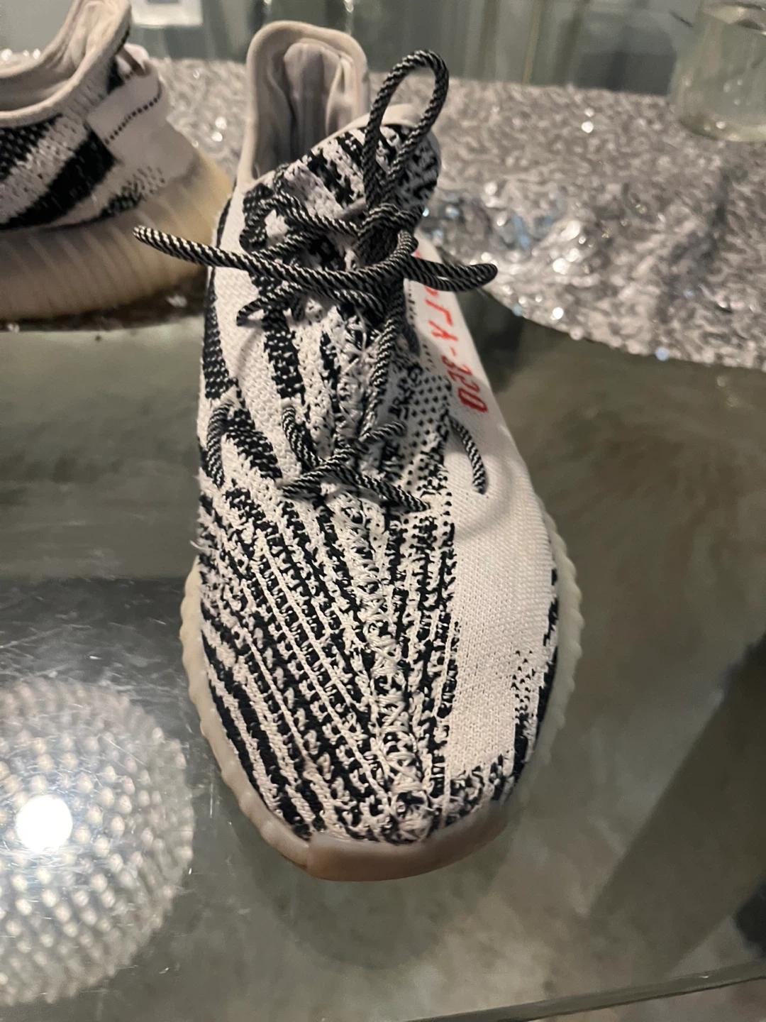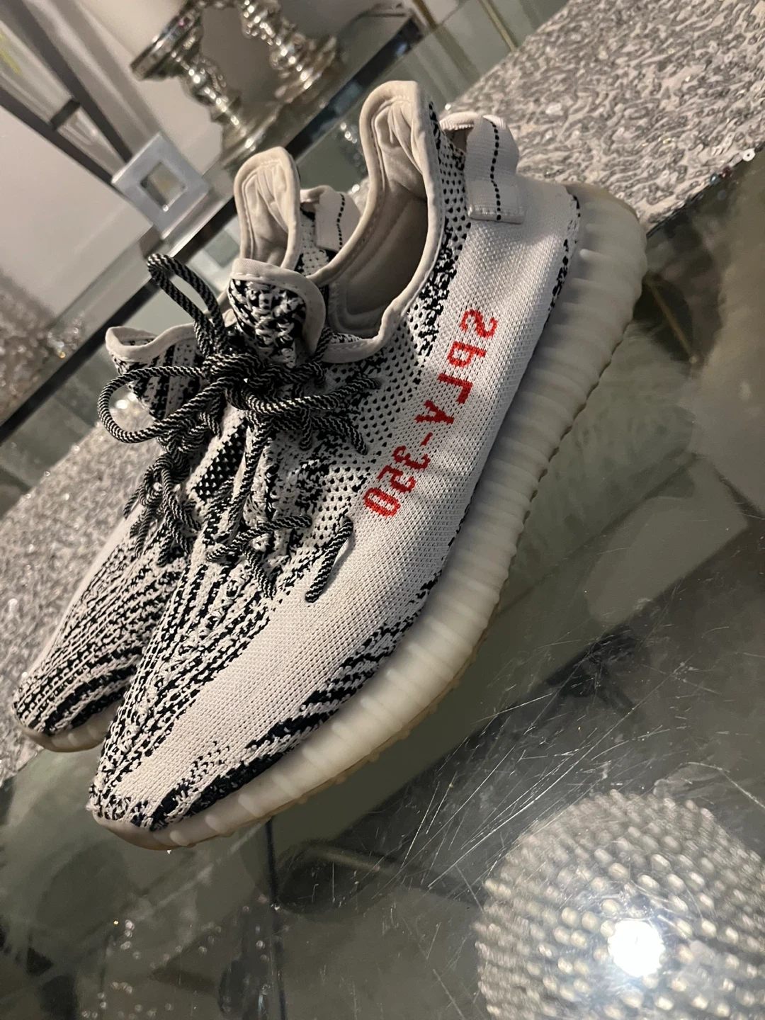 Classic zebra stripe pattern on these Adidas Yeezy Boost 350 V2 sneakers. The knit upper provides a comfortable and snug fit. Translucent midsole for cushioning.