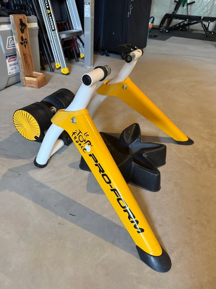 ProForm Le Tour de France indoor bike trainer in great condition. Perfect for cycling training at home during winter or bad weather. Stable, compact and easy to set up. Features: ProForm Le Tour de France bike trainer, Indoor cycling training stand, Foldable legs for easy storage, Includes front wheel riser block, Compatible with road bikes and mountain bikes. Great for cyclists who want to train indoors. Pickup in Mahogany. If the ad is up, it's still available. Open to reasonable offers.