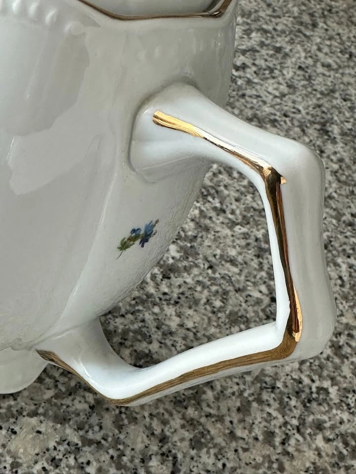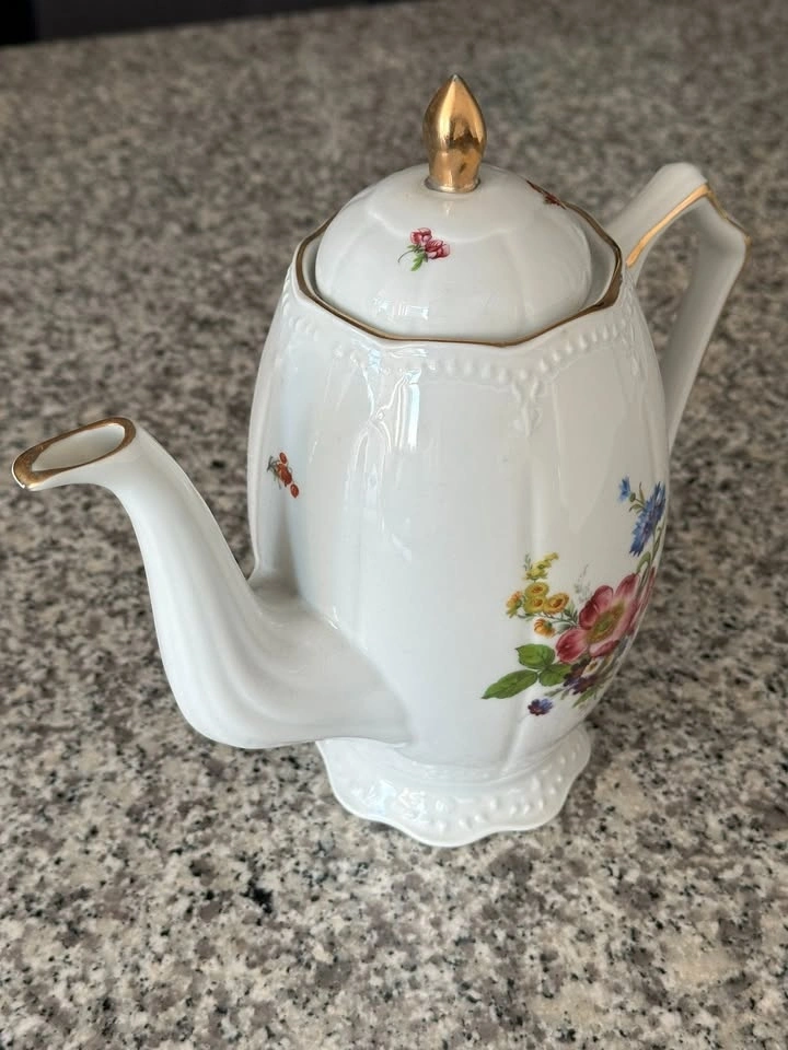 A lovely white teapot adorned with floral designs and elegant gold trim. It's in great condition and ready to add a touch of charm to your tea time. Pick up near 777 Bay St.