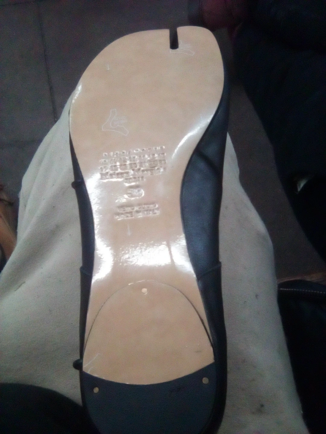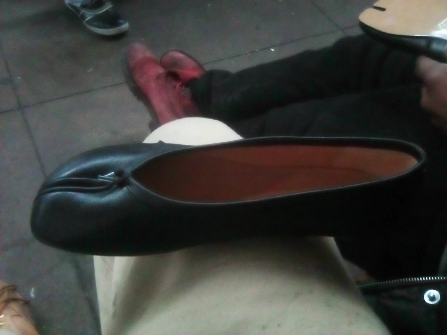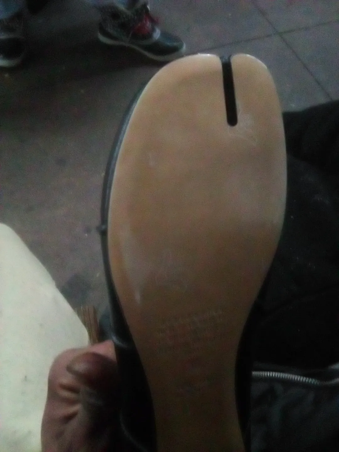 These Maison Margiela ballerina flats are black leather. They feature the iconic Tabi split-toe design and a small bow detail at the vamp. The sole is stamped with the brand name and "PARIS".