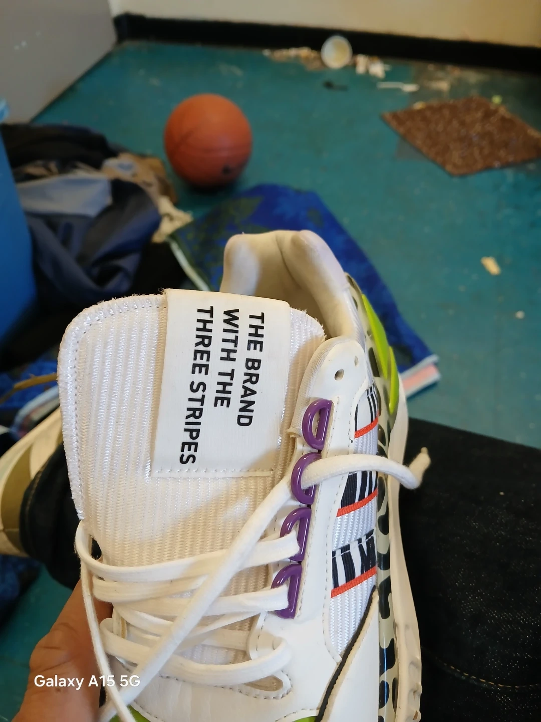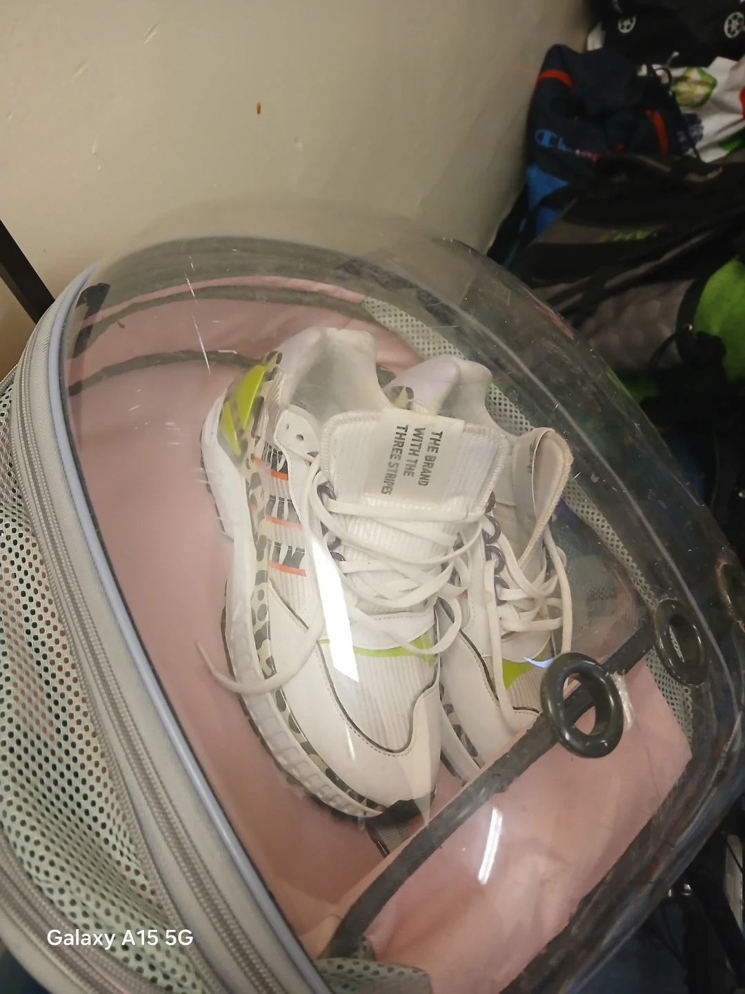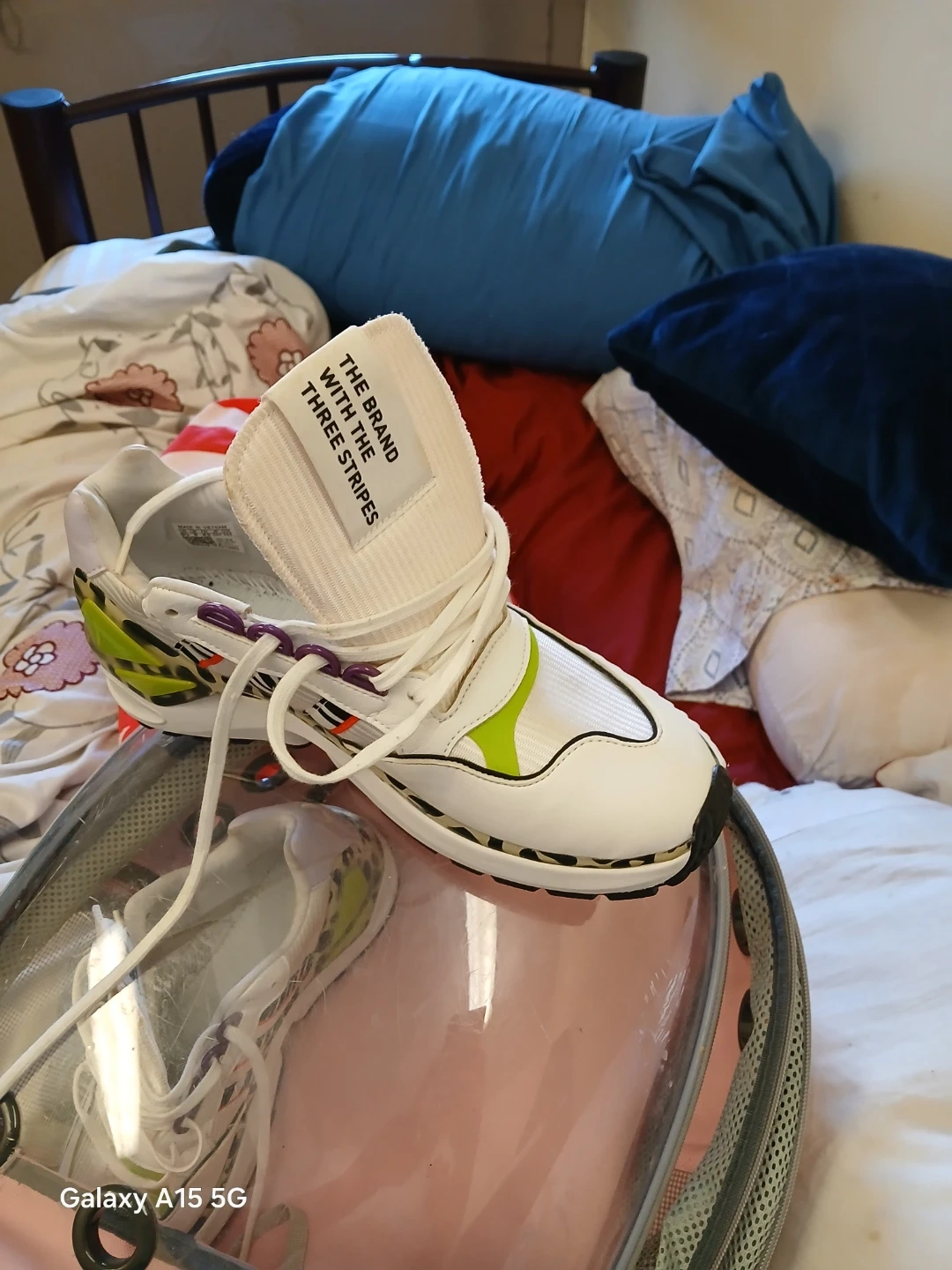 Selling a pair of Adidas sneakers featuring the iconic "The Brand With The Three Stripes" design! These are white with some pops of color and a unique sole. They come in a cool, protective case, too