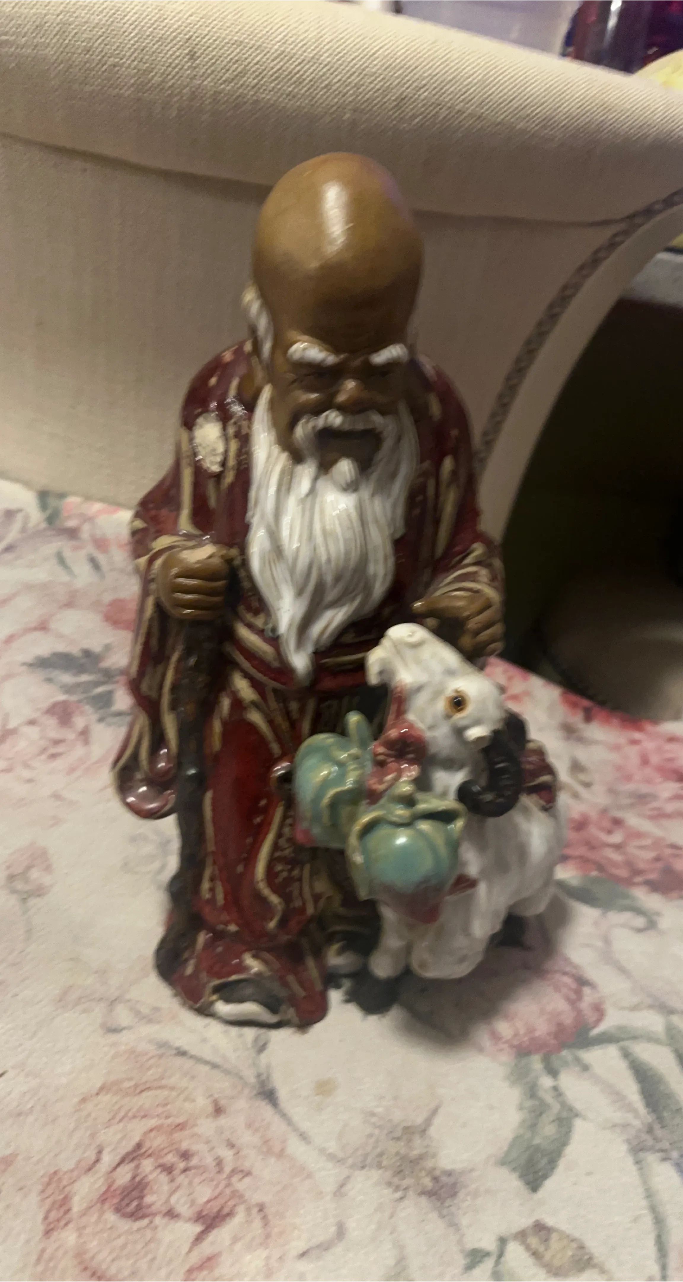 Here's a vintage ceramic figurine featuring a man with a long white beard and a white animal carrying green objects. It is in good condition and would be a great addition to any collection!