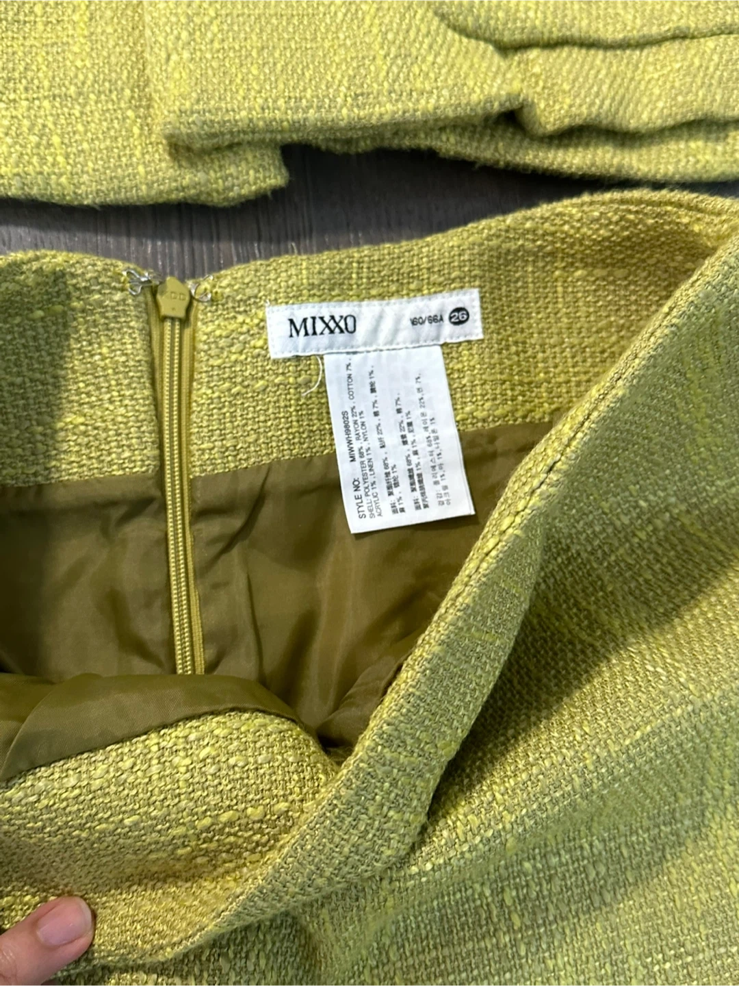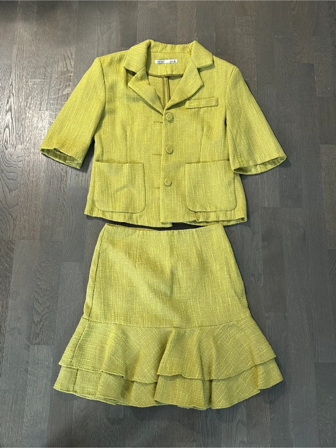 Selling a cute Mixxo green tweed skirt suit! The set includes a blazer-style jacket and a matching skirt with a ruffled hem. The size is 26. Perfect for a stylish and polished look!