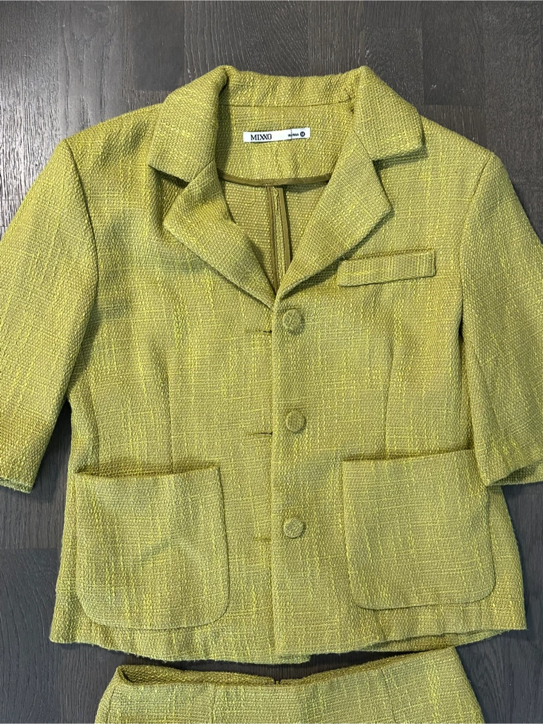 Selling a cute Mixxo green tweed skirt suit! The set includes a blazer-style jacket and a matching skirt with a ruffled hem. The size is 26. Perfect for a stylish and polished look!