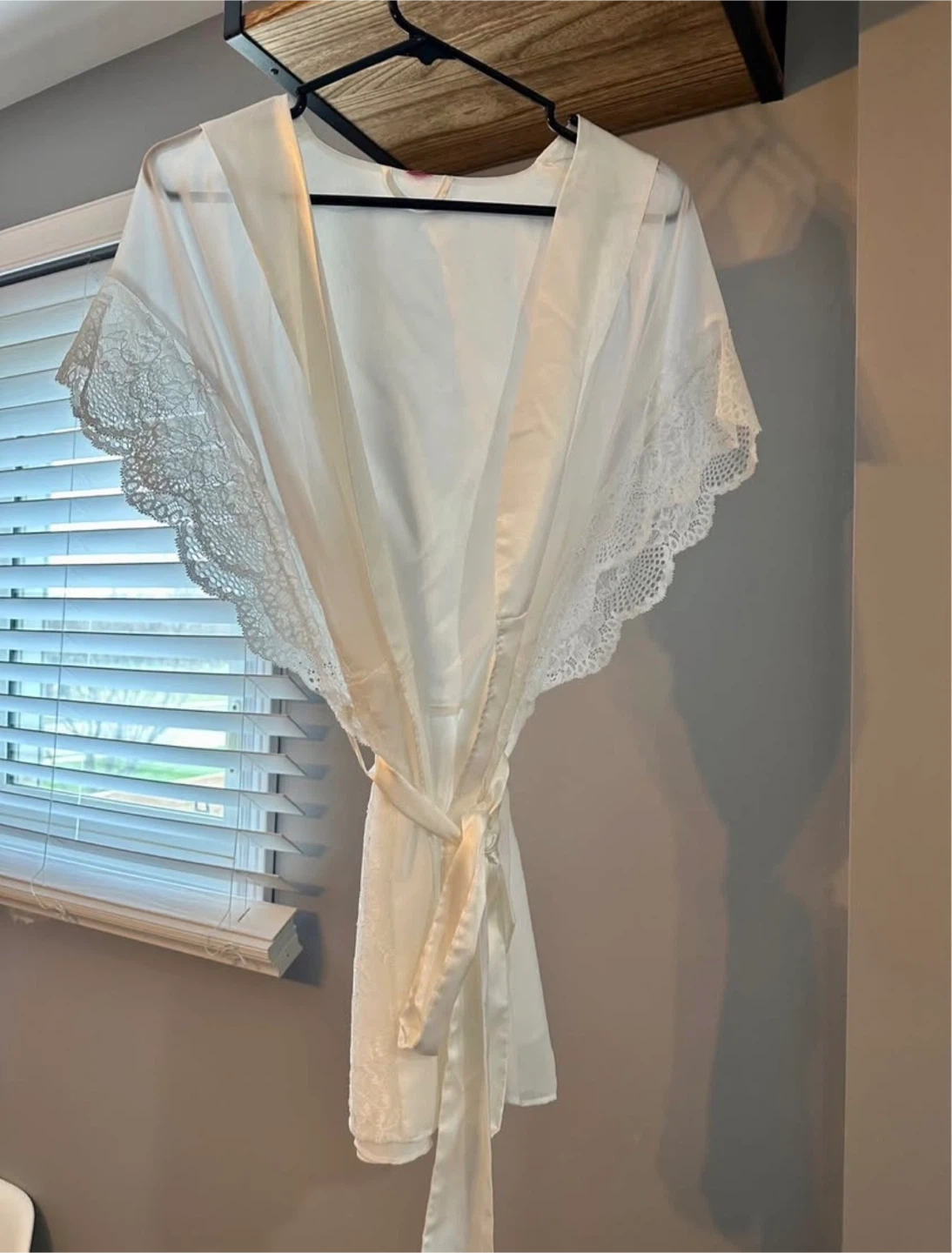 A silky white robe with lace trim on the sleeves and hem. It comes with a matching tie belt. Lightweight material.