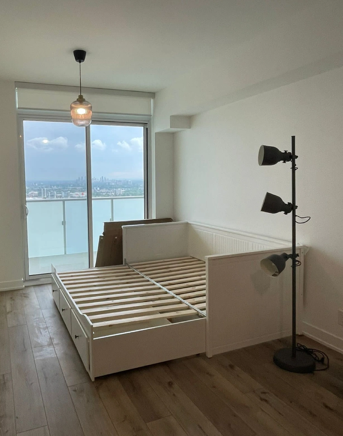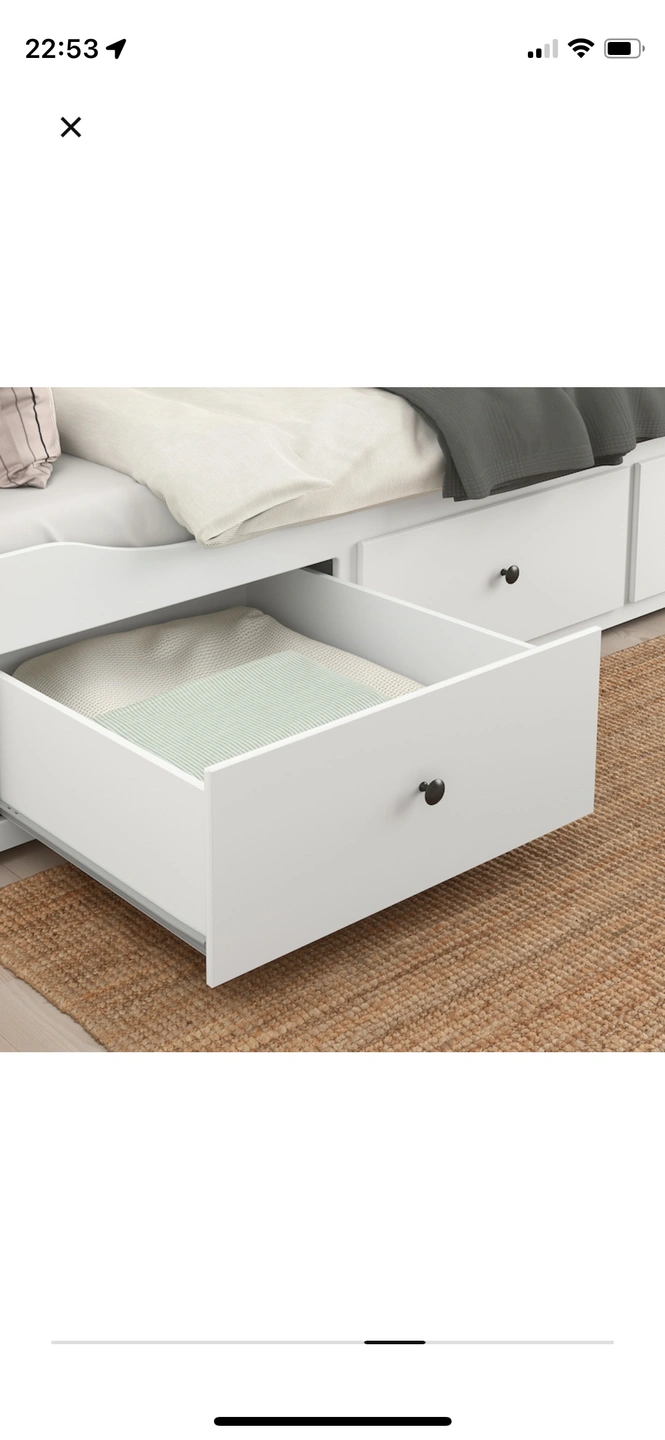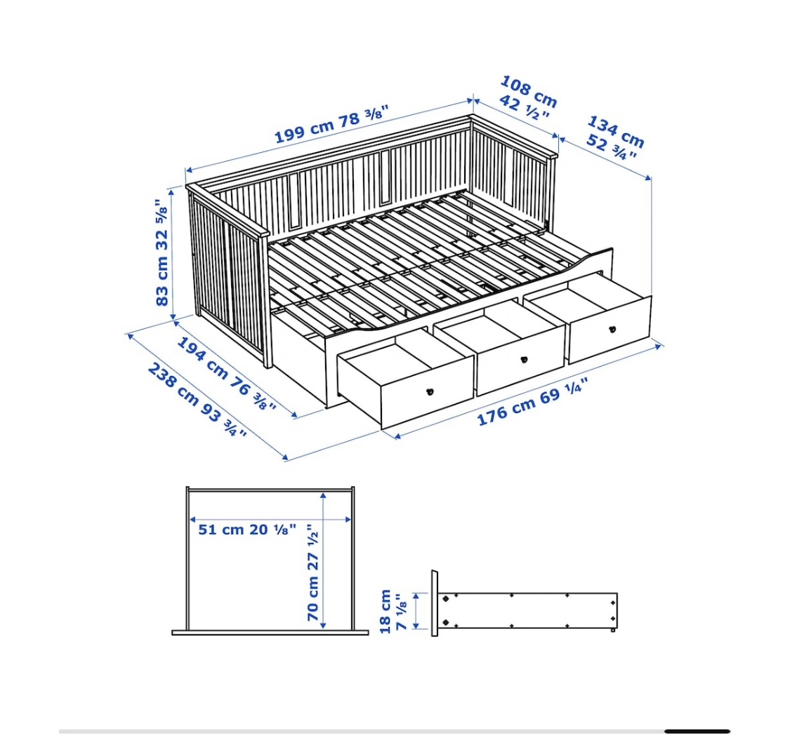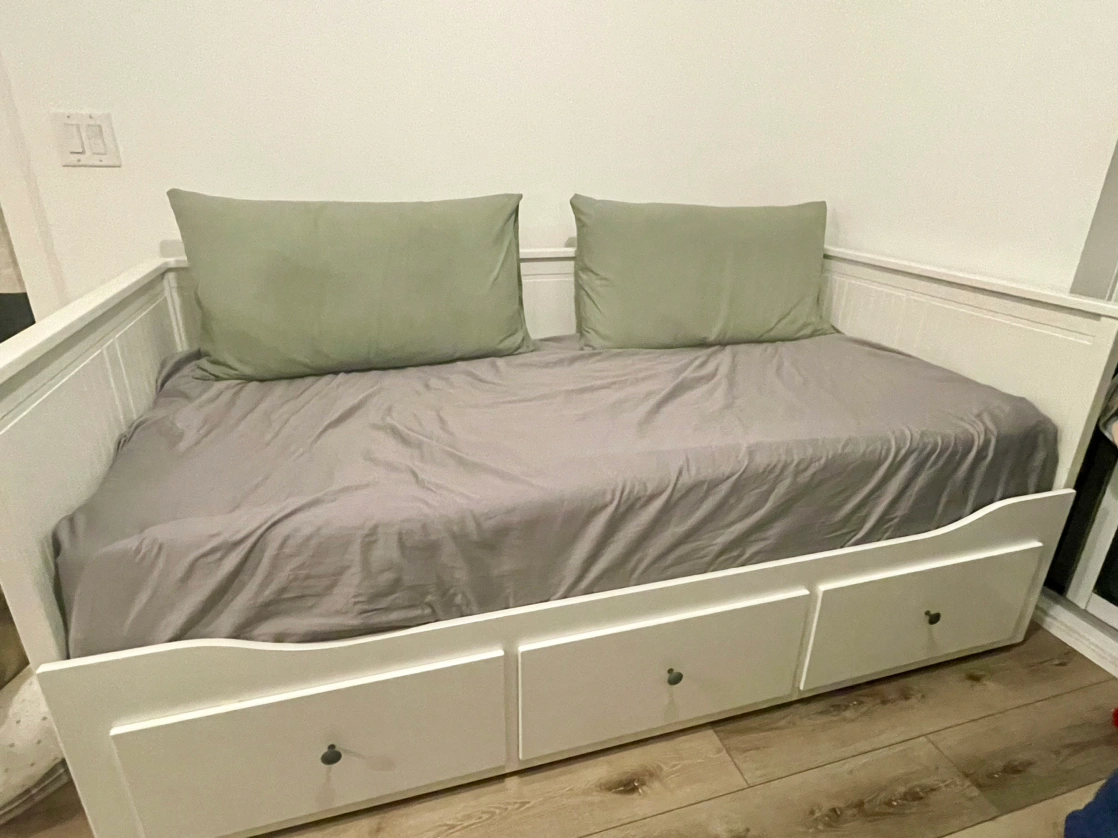 Expandable up to king size. Comes with 2 upgraded Meistervik twin mattresses. Firm and comfortable, lightly used with mattress protector. 3 large drawers for storage.