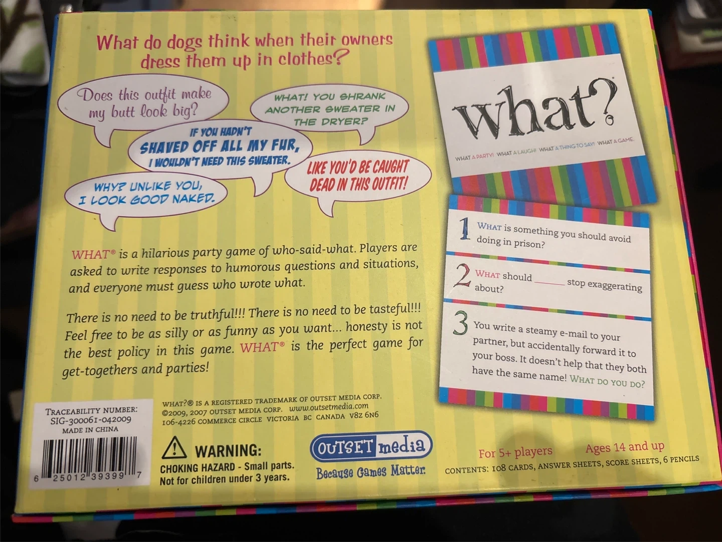 Selling the "What?" party game by Outset Media! It's a hilarious game of who-said-what, perfect for get-togethers and parties. For 5+ players, ages 14 and up. Includes 108 cards, answer sheets, score sheets, and 6 pencils