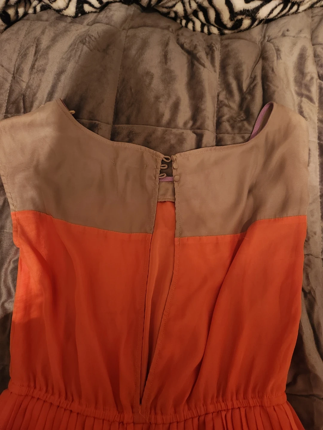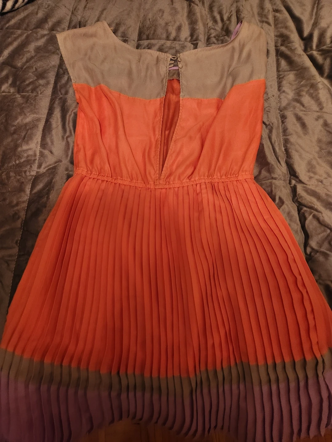 This dress features a colour-block design with pleated detailing. It has a round neckline and a concealed zipper closure at the back. The fabric is lightweight and flowy. If you interested chat with me and I'll give you the meeting spot/my address.