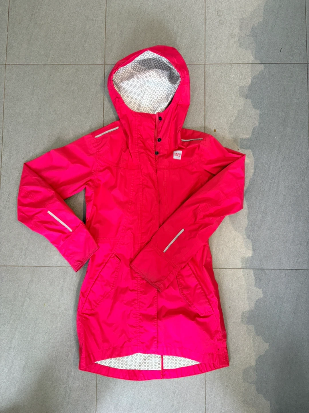 This MEC hooded jacket is a bright pink colour. It has reflective strips on the sleeves and chest. It's lightweight and features a patterned interior lining.