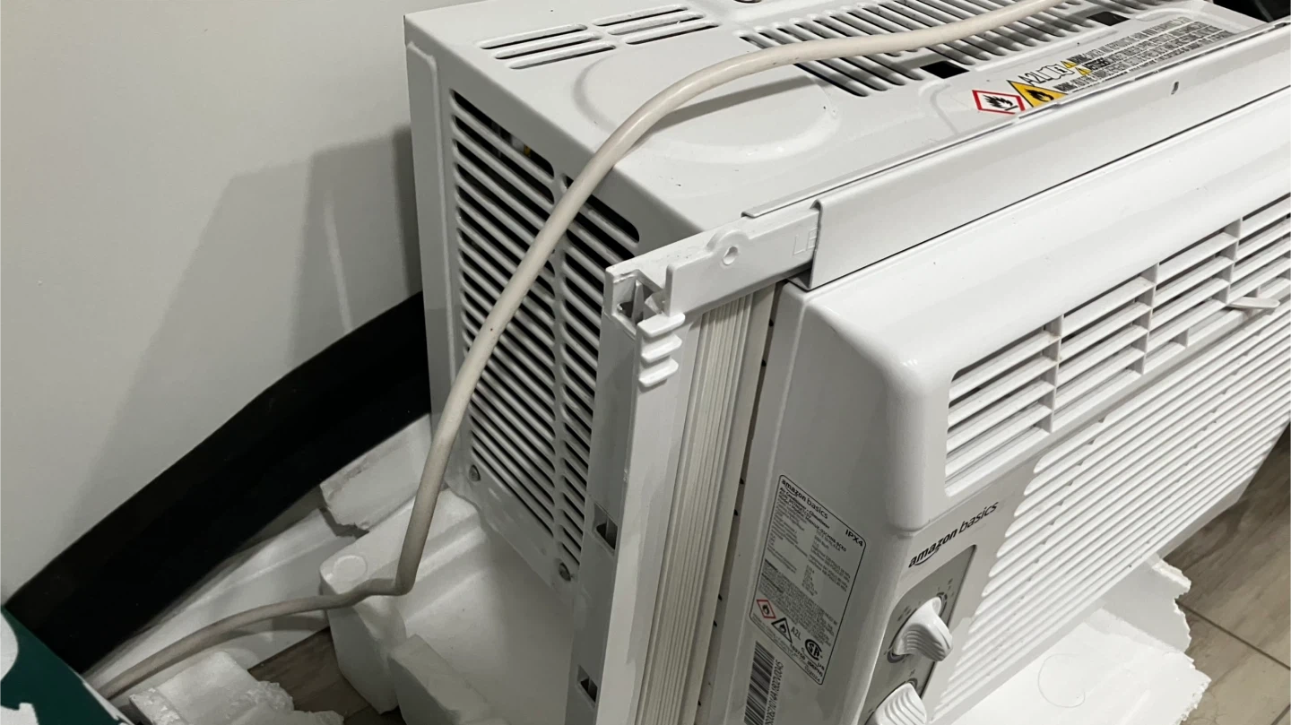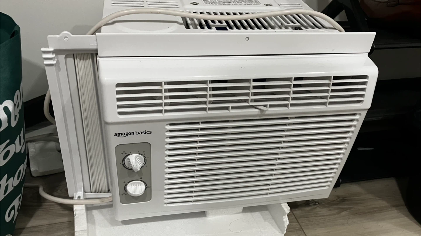 Amazon Basics window air conditioner. It's white and comes with adjustable knobs for temperature and fan speed. Ready to keep your space cool! Amazon Basics 5000-BTU Window Air Conditioner with Quiet Operation, Up to 150 Sqf, Cool and Fan Functions, Washable Filter, Adjustable Window Kit, Intuitive Mechanical Controls, for Small Room, White. Pickup only.