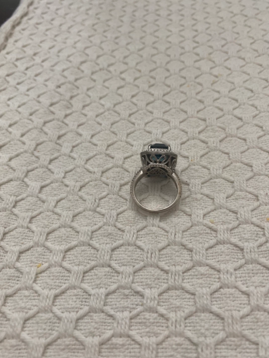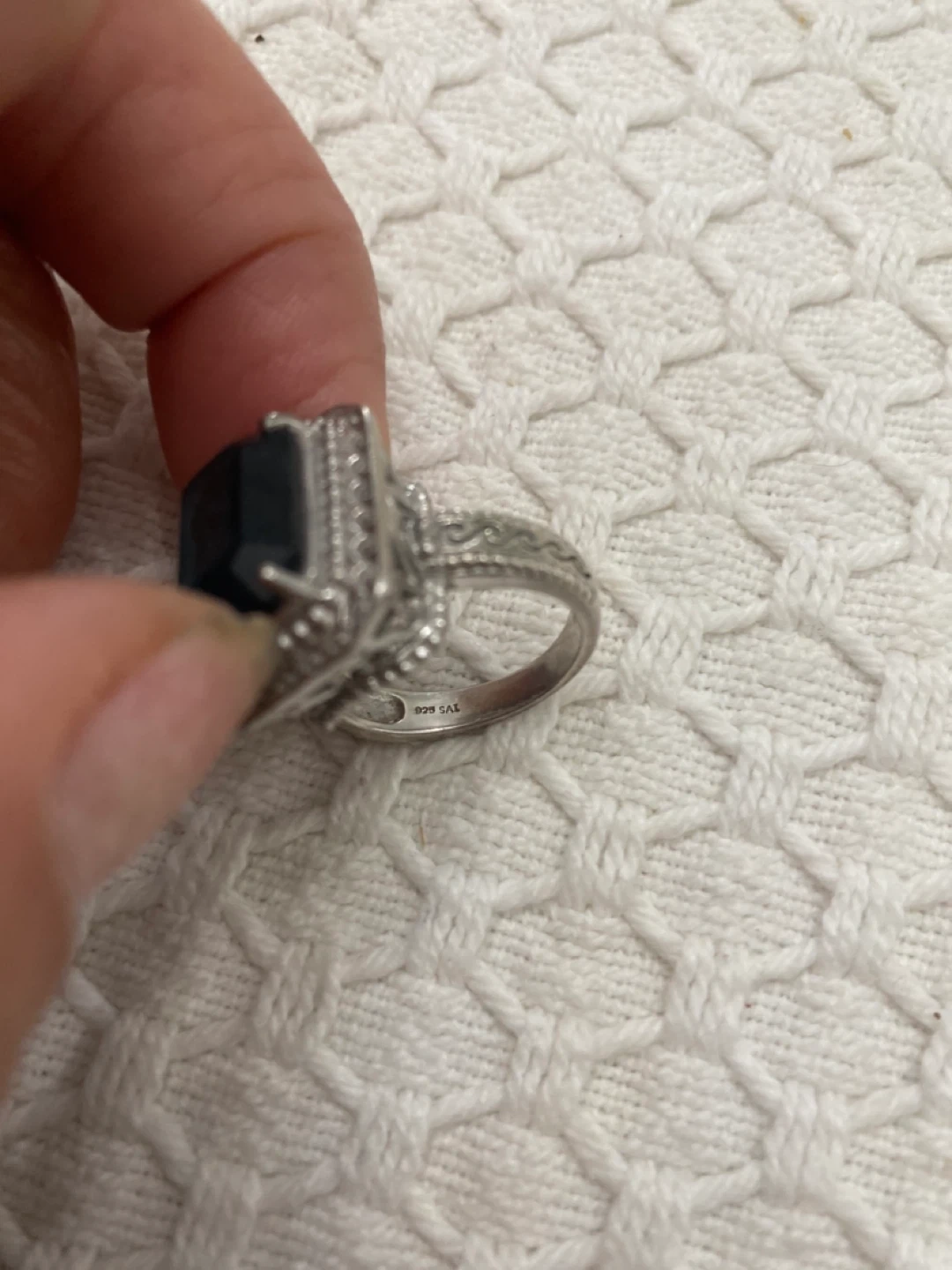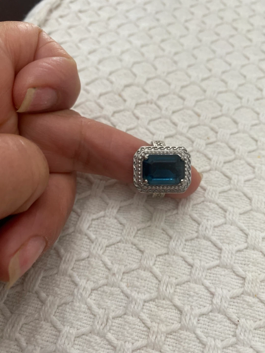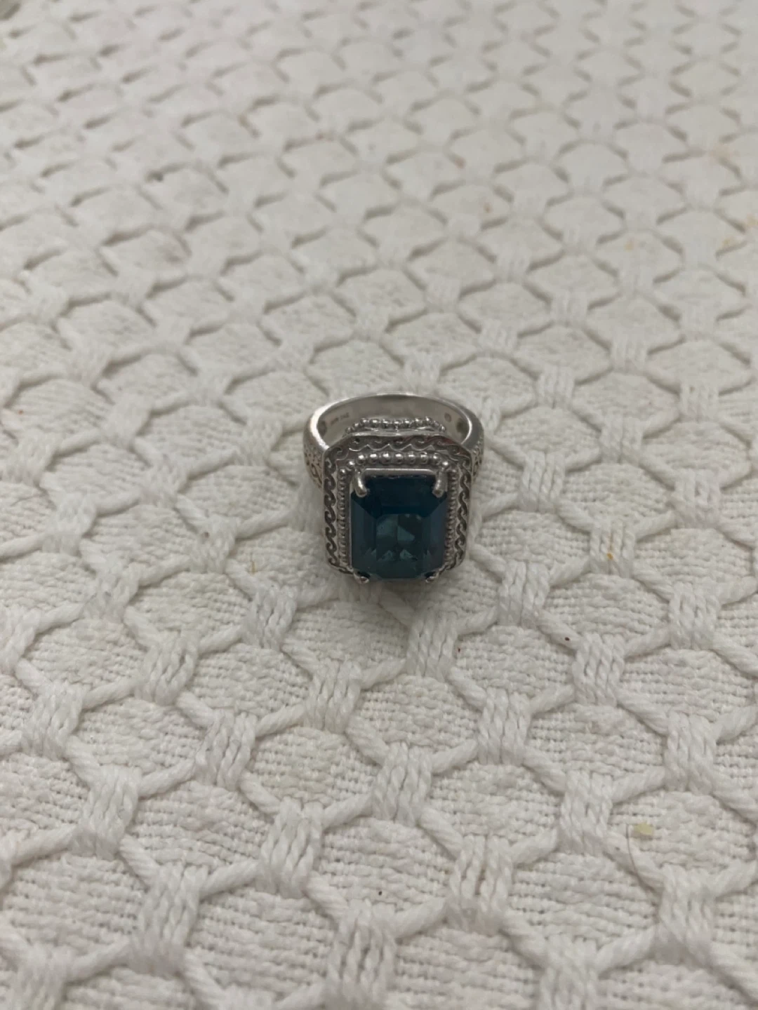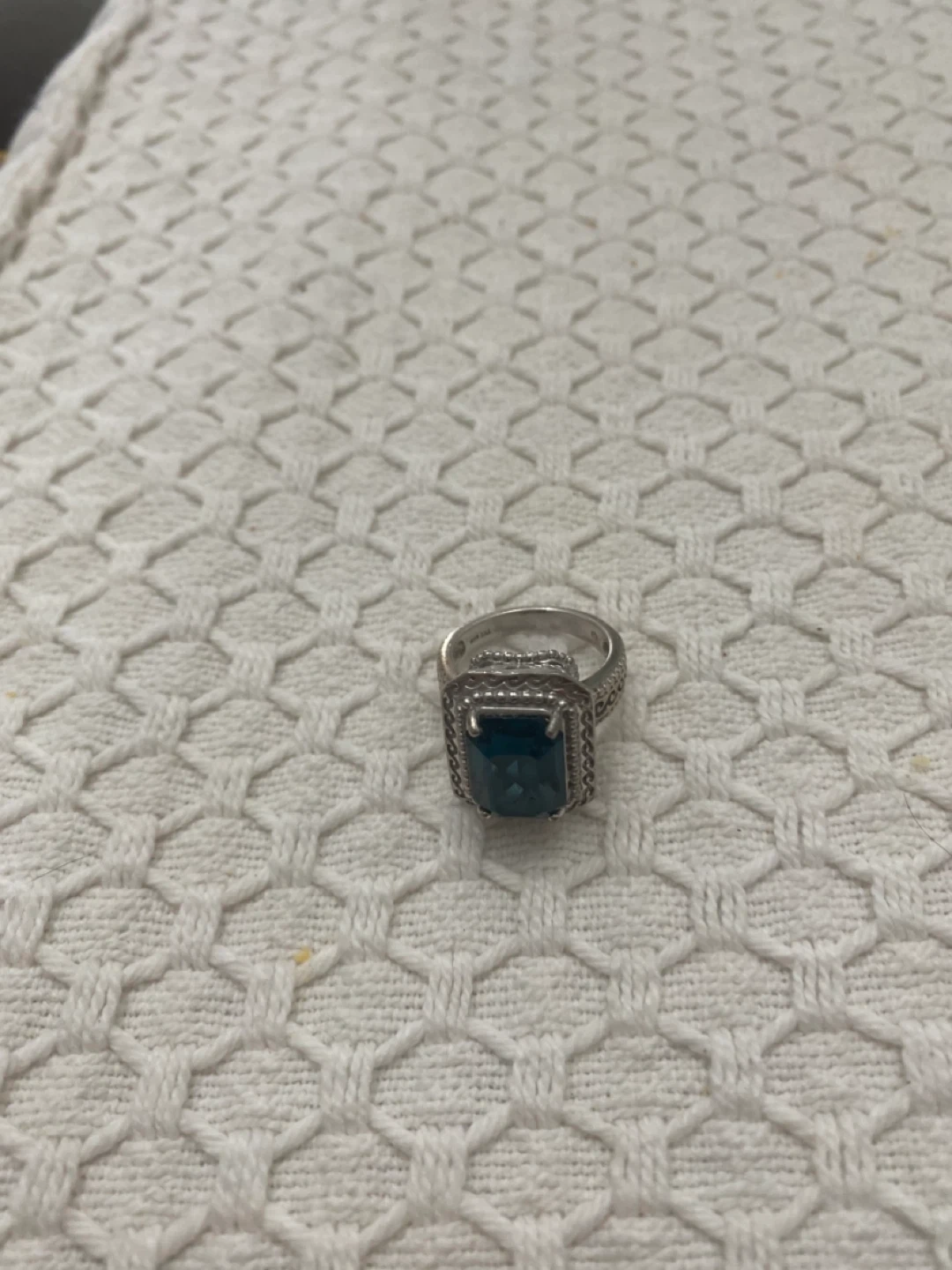 Beautiful sterling silver ring featuring a rectangular blue gemstone, likely a London Blue Topaz. The band is intricately designed with decorative etching and a "925" stamp. It's a statement piece that adds elegance to any outfit!have little dent