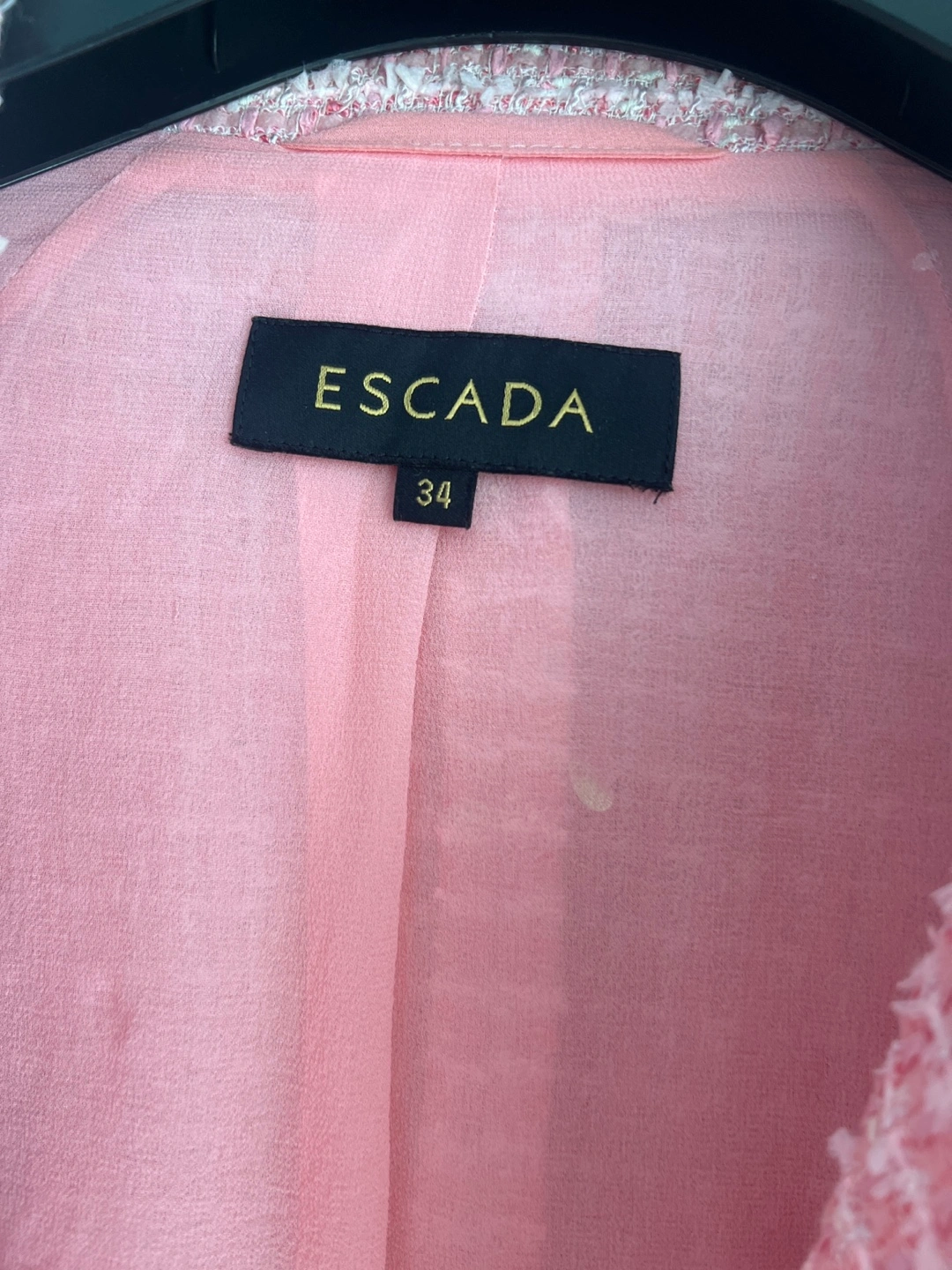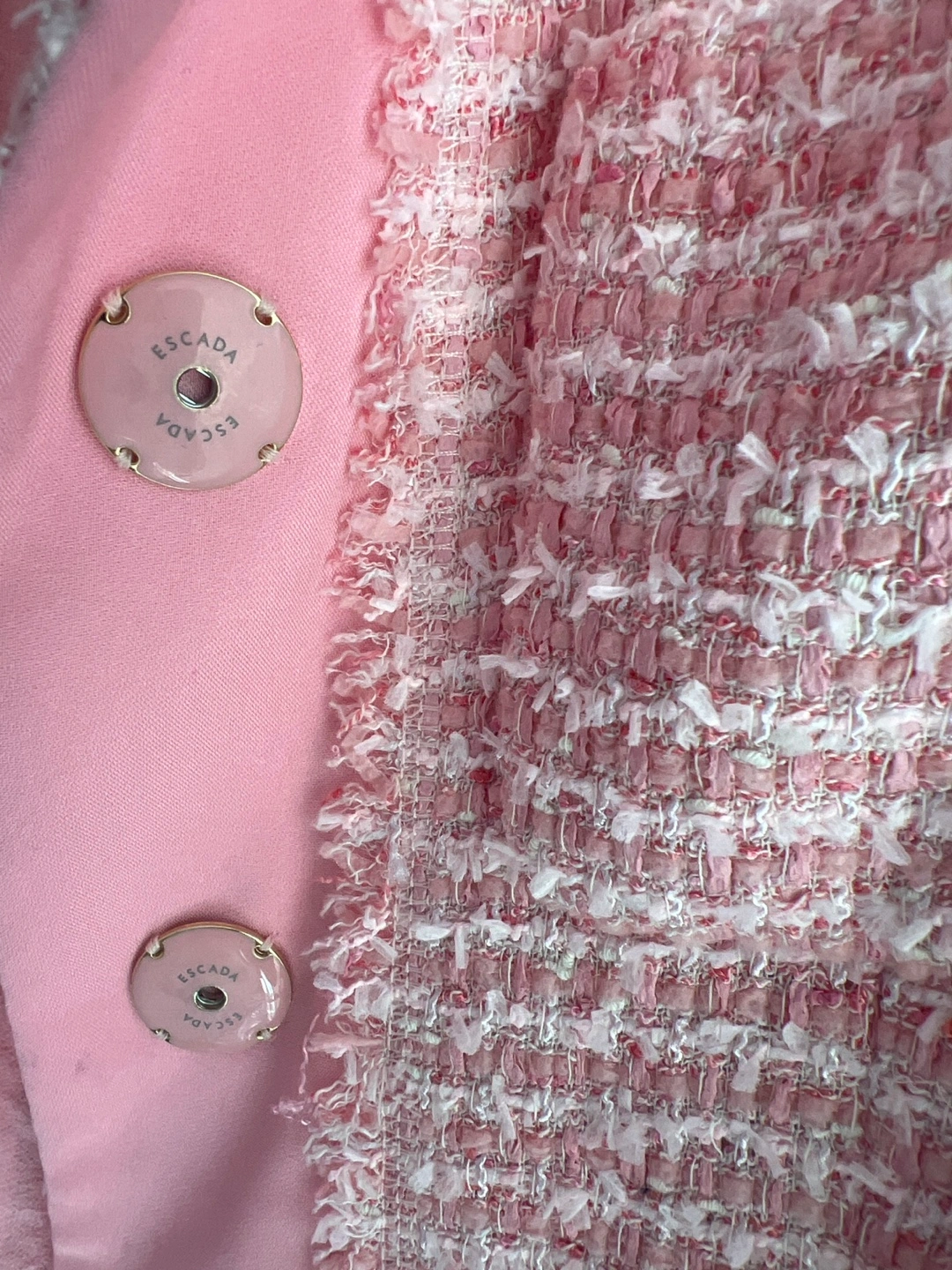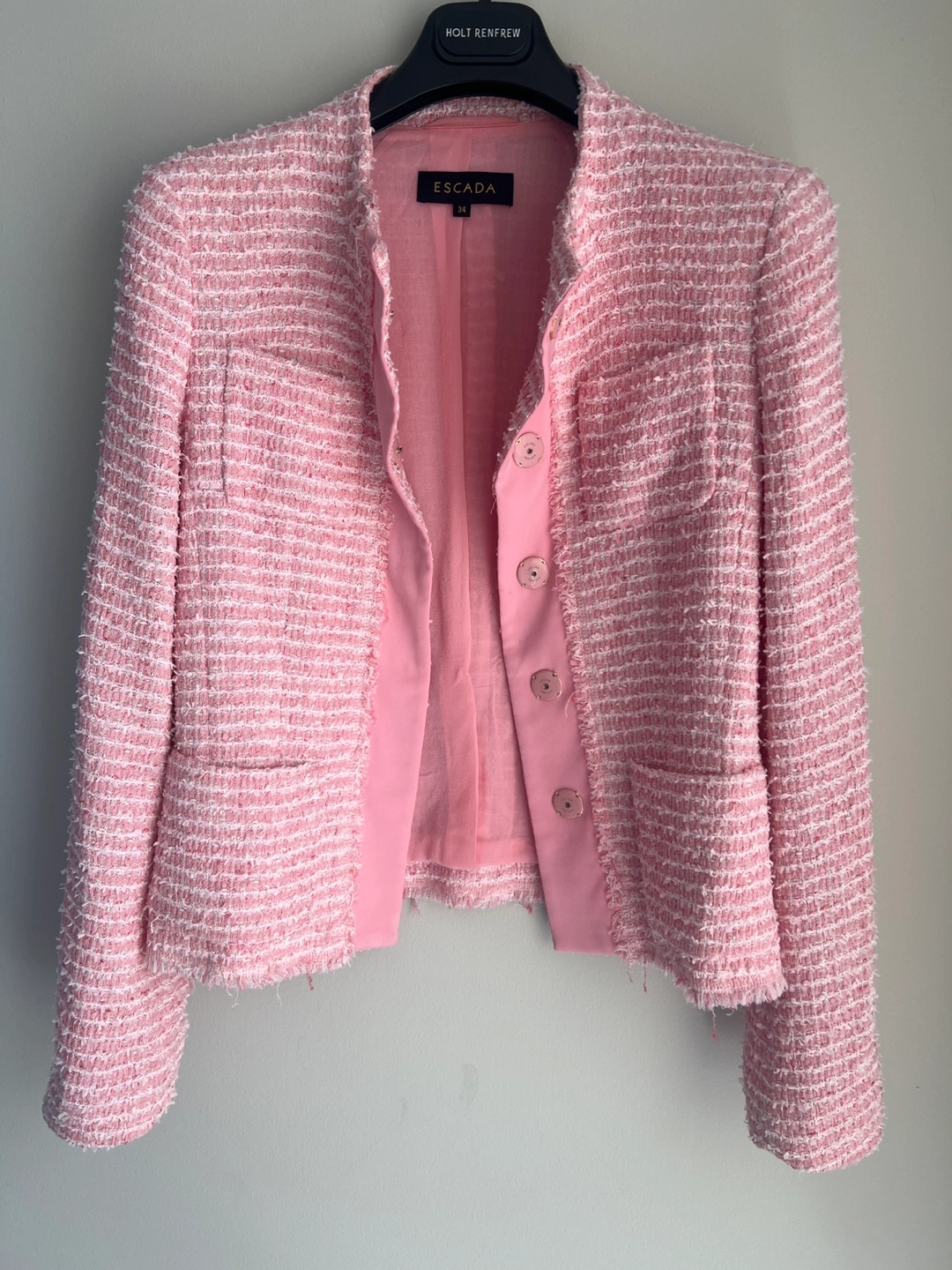 Selling a gently used Escada blazer in a lovely pink tweed. It's a European size 34. The buttons also have the Escada logo on them. It's in great condition and ready for a new home!