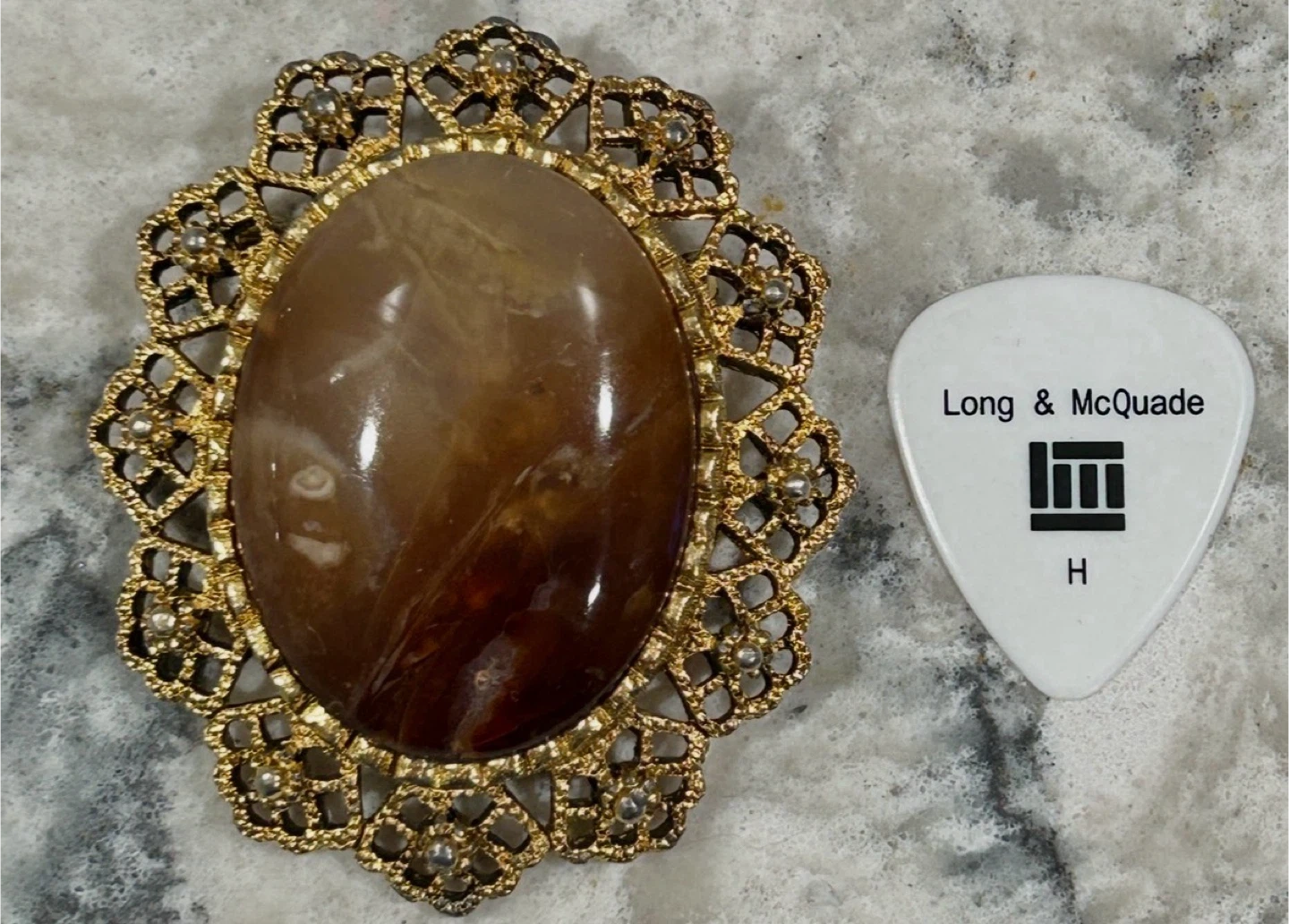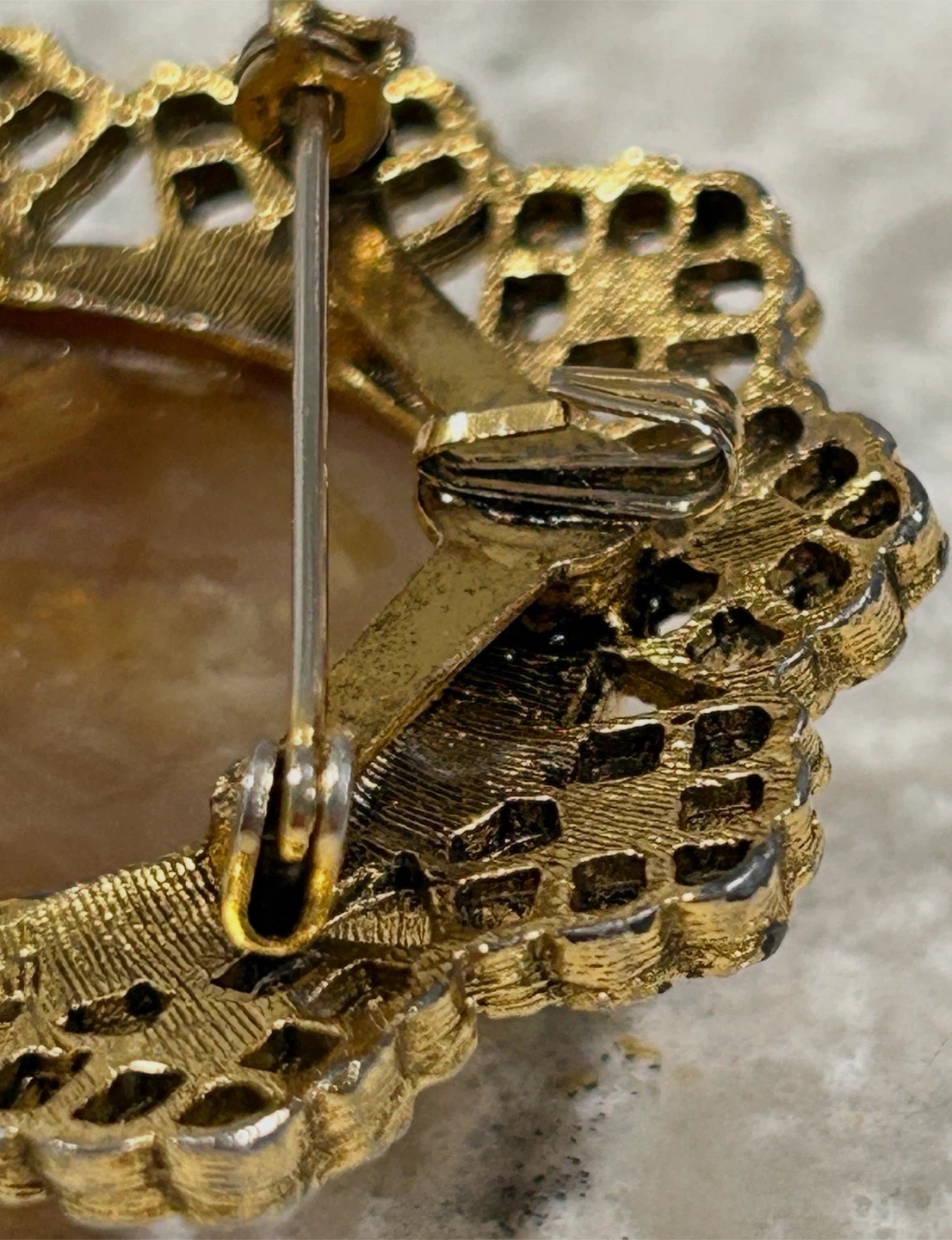 Features a brown stone set in a gold-tone metal filigree setting.