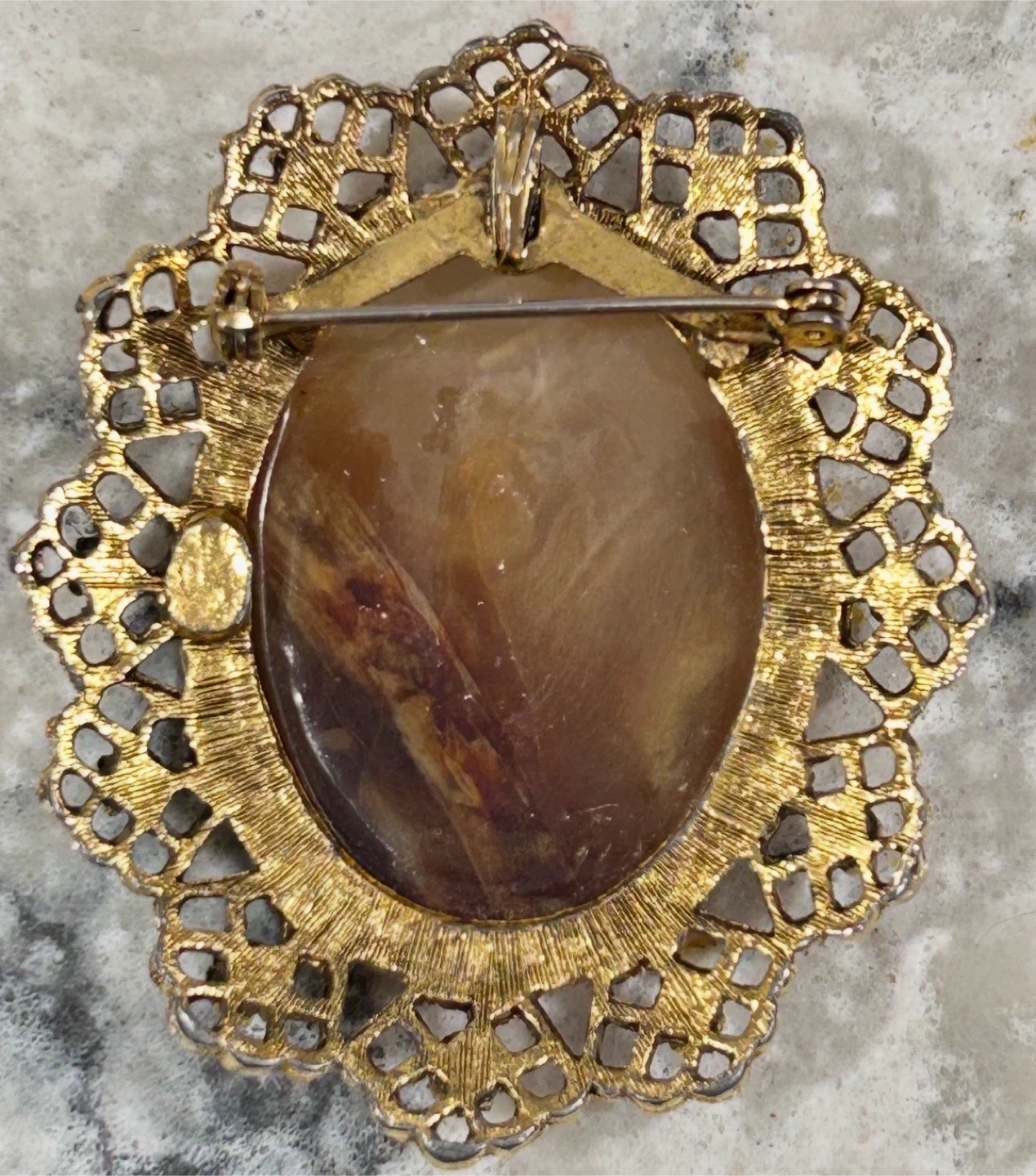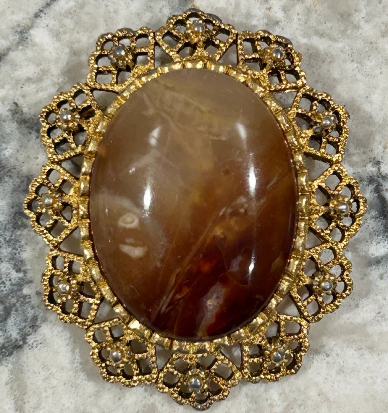 Features a brown stone set in a gold-tone metal filigree setting.