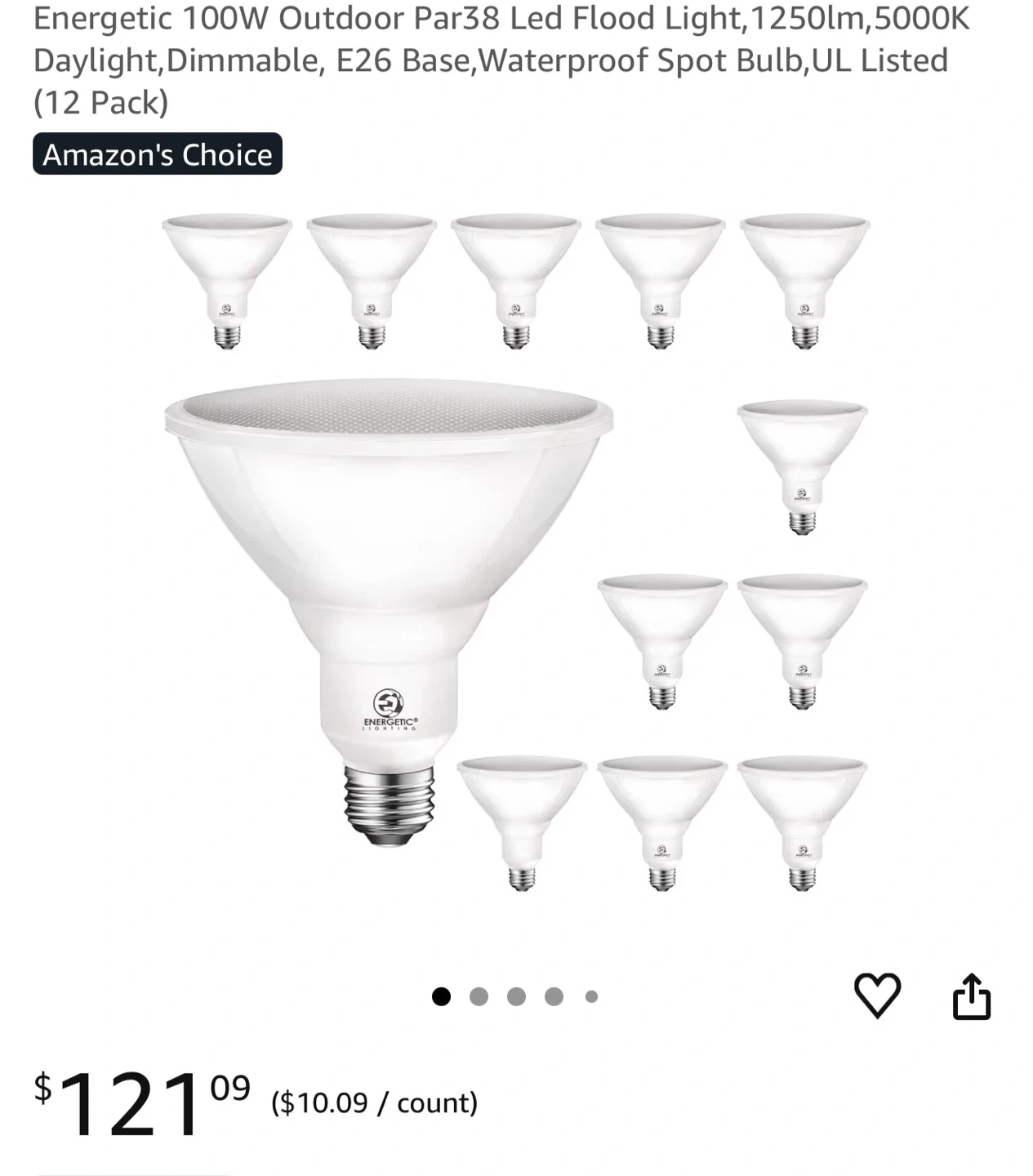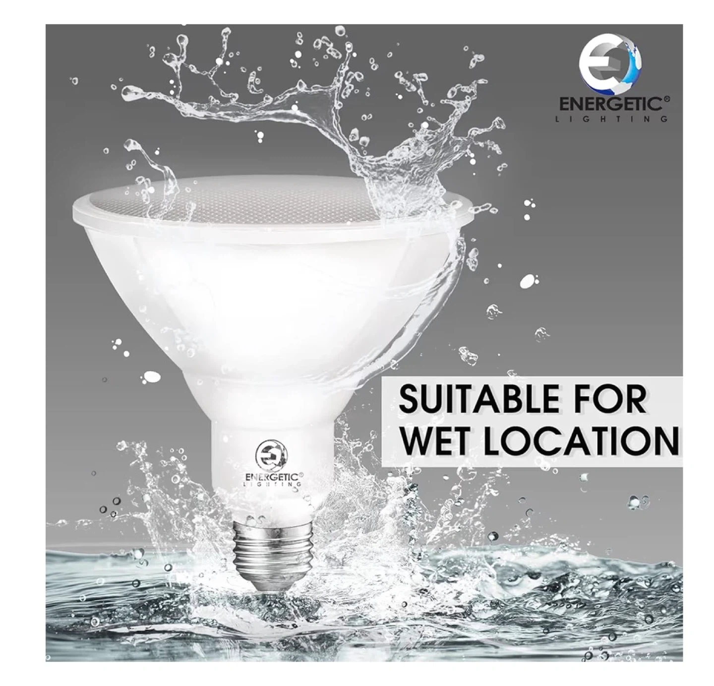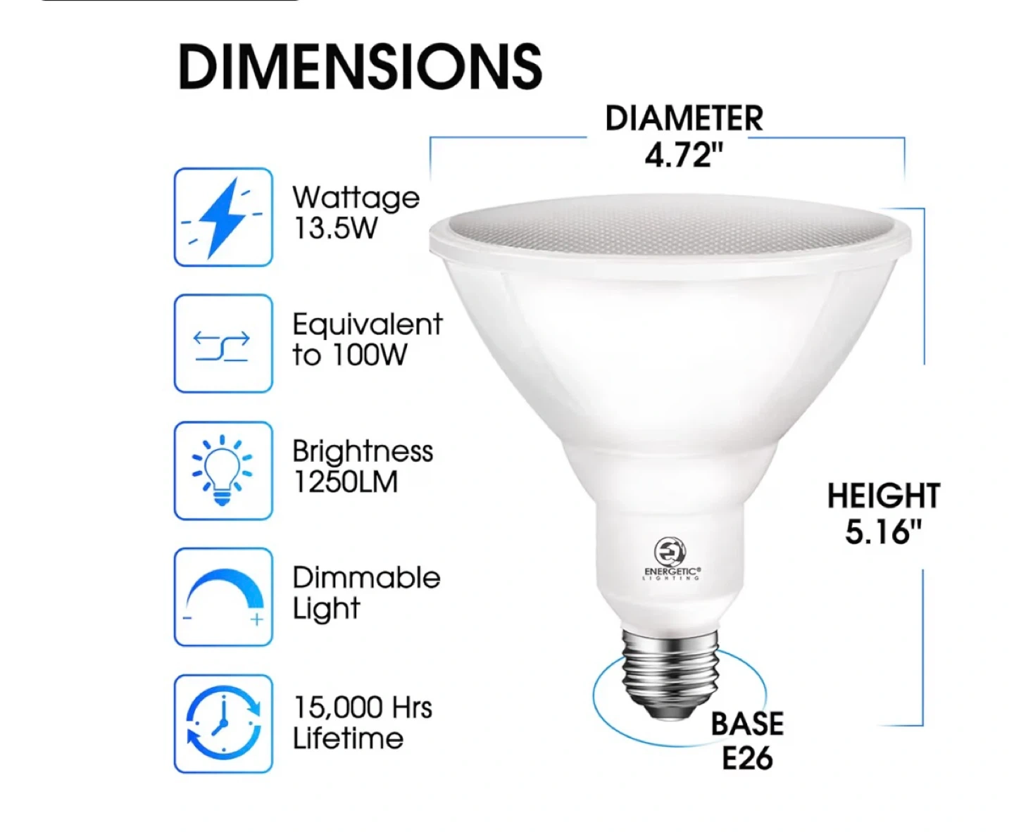 These Energetic outdoor flood lights are 100W equivalent with 1250 lumens brightness. They're dimmable from 10% to 100% and suitable for wet locations. The bulbs have an E26 base and a lifetime of 15,000 hours. This pack includes 12 bulbs.