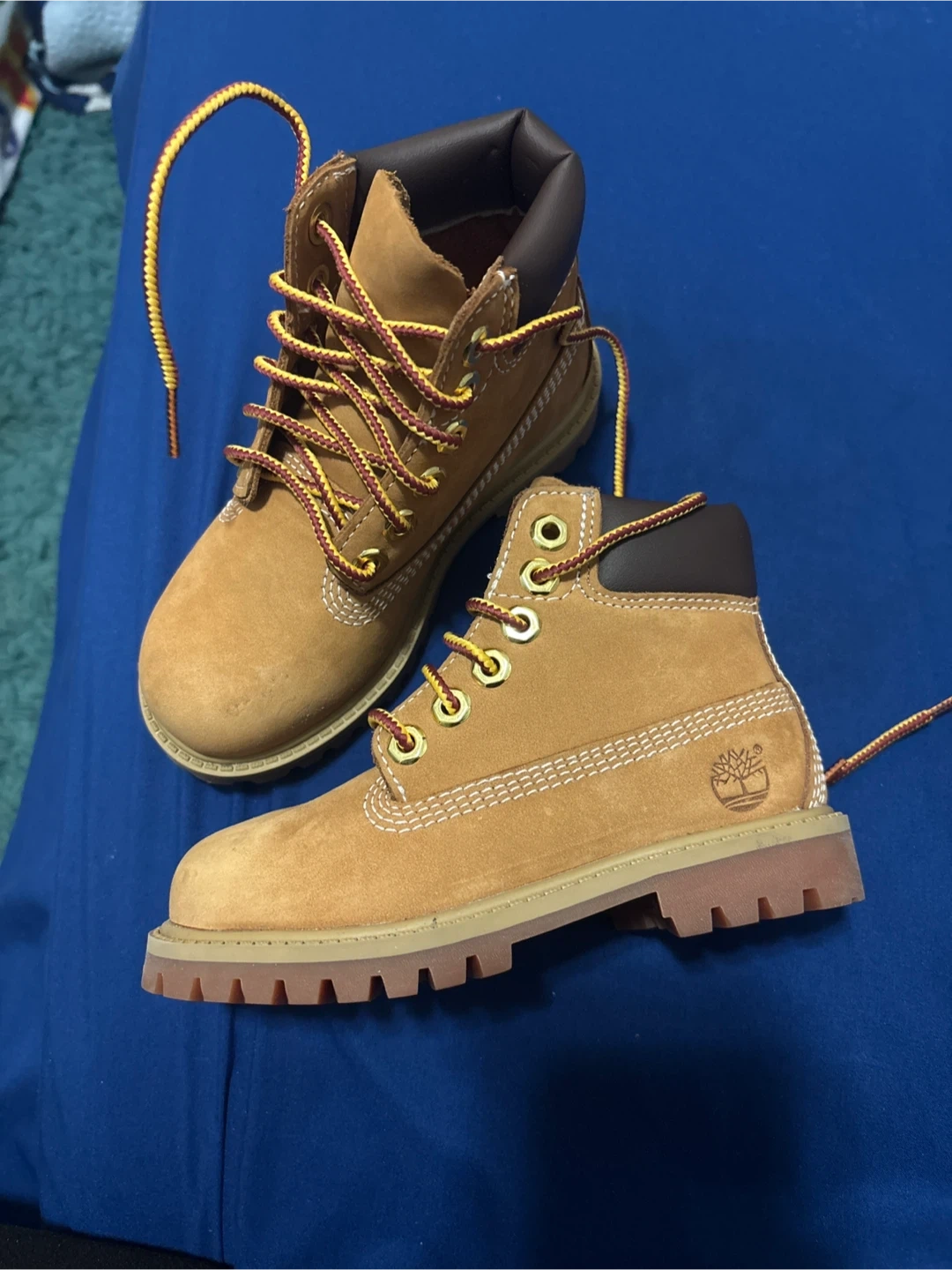 Timberland classic 6-inch premium waterproof boots in a tan nubuck leather. These boots feature a padded collar and a lug sole for traction. They have red and yellow laces. SIZE 9 Toddler