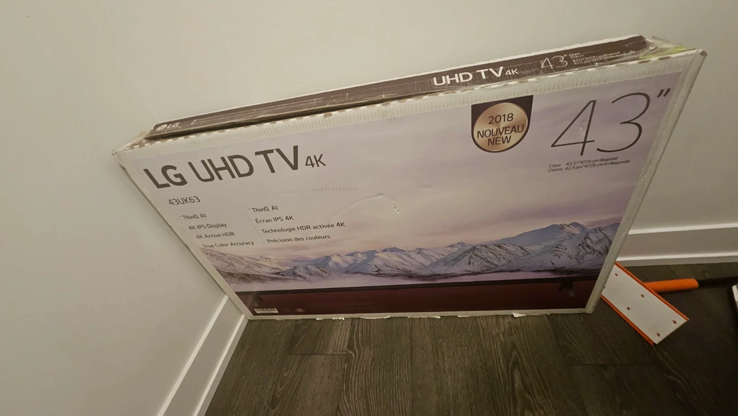 This is an LG 43-inch UHD 4K TV. It features ThinQ AI, a 4K IPS display, and Active HDR. True Color Accuracy. Includes original box. Assembled in Mexico.