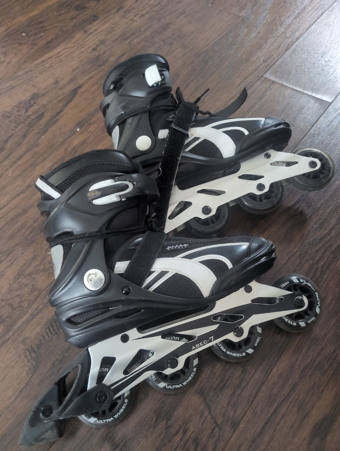 Black and white inline skates with ABEC-7 bearings and 76mm Ultra Wheels. These skates are designed for smooth rolling. They're suitable for recreational skating.