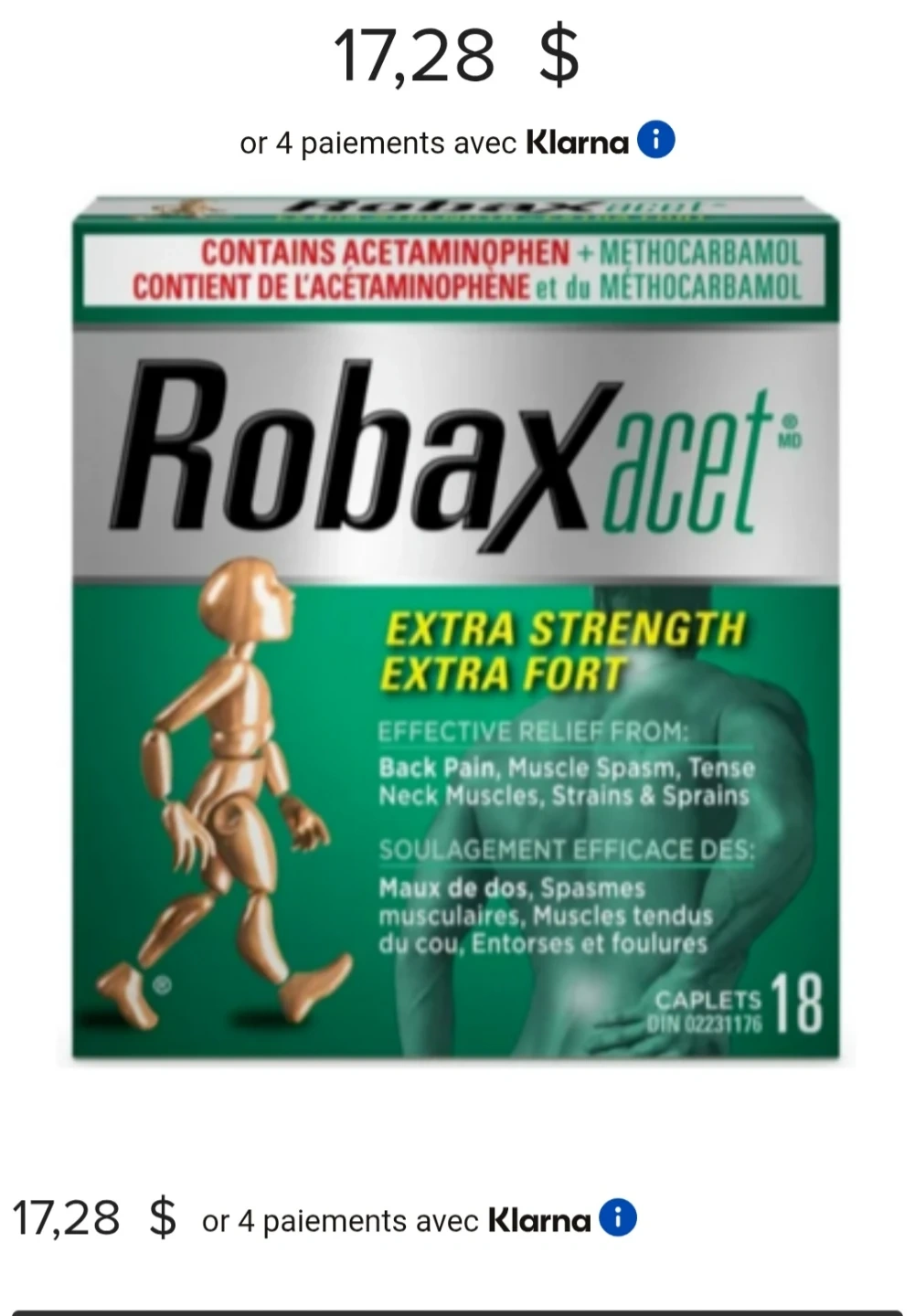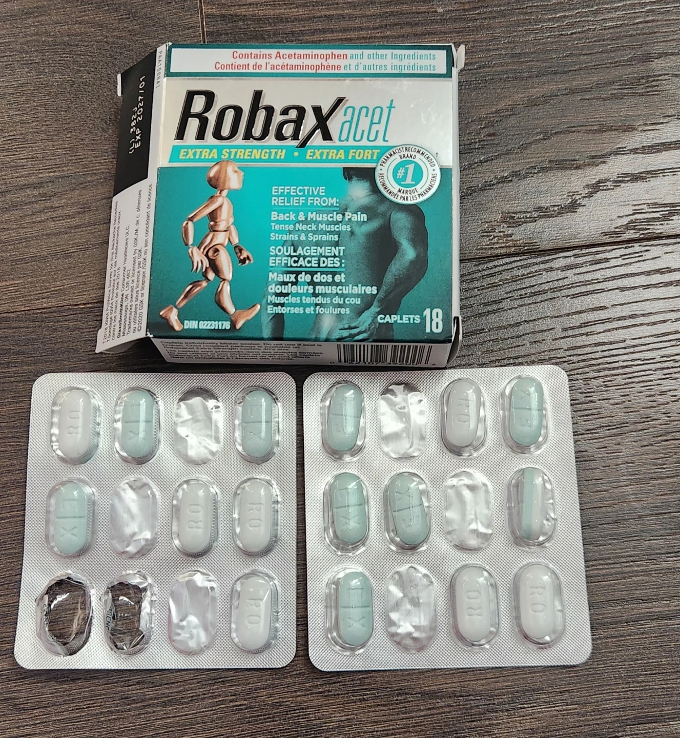Robaxacet Extra Strength caplets contain Acetaminophen and Methocarbamol. Effective relief is provided for back and muscle pain, tense neck muscles, strains, and sprains. Expiration date is 2027/01. 2 pills are gone so there are 16 left.