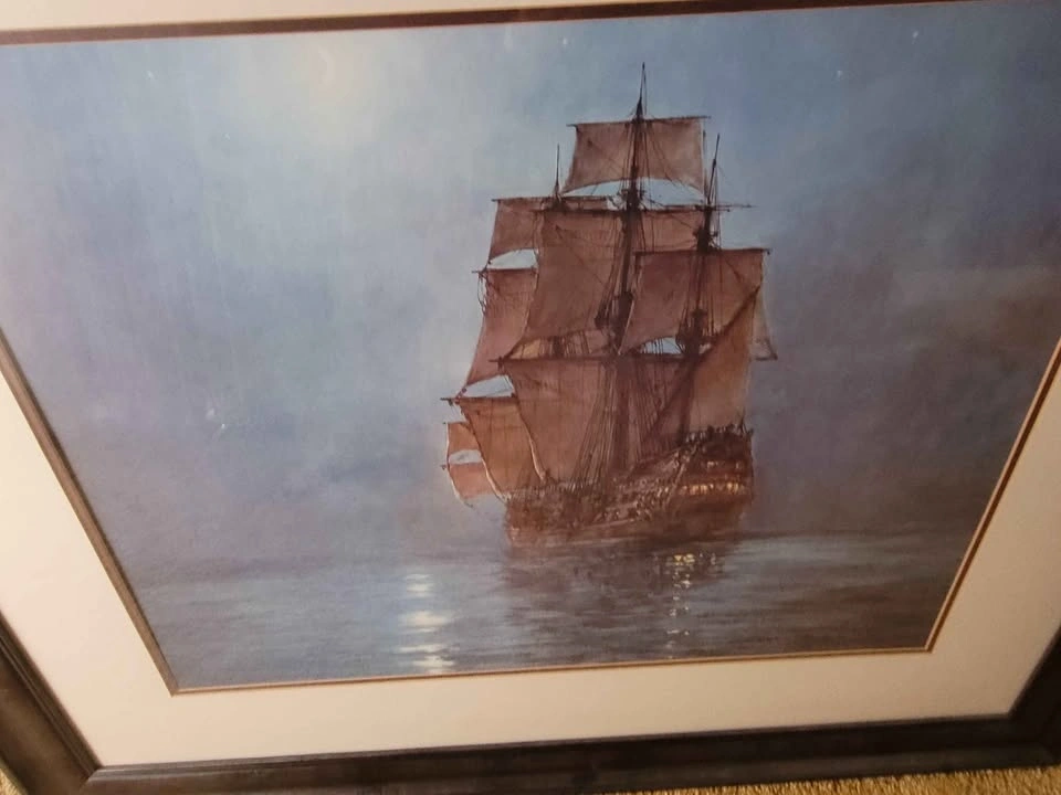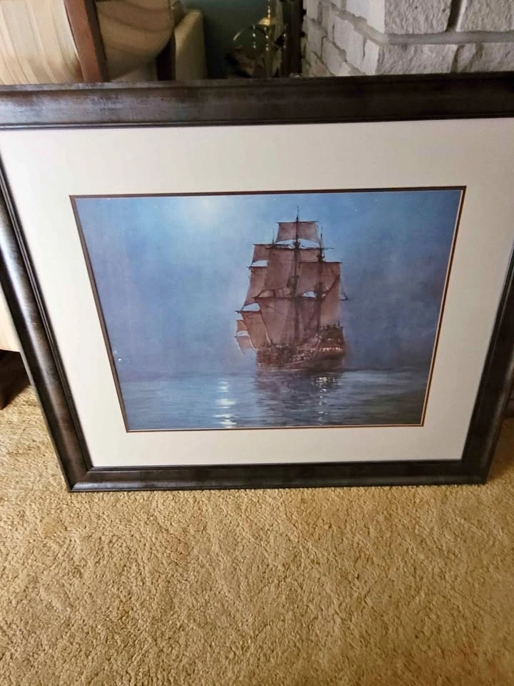 Professionally framed print of a tall ship/galleon. It would make a stunning addition to any room. Dimensions are 34.75 inches tall by 40.75 inches wide.