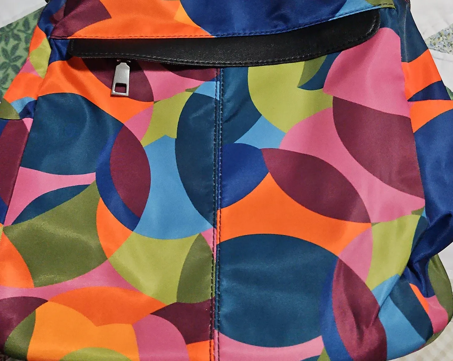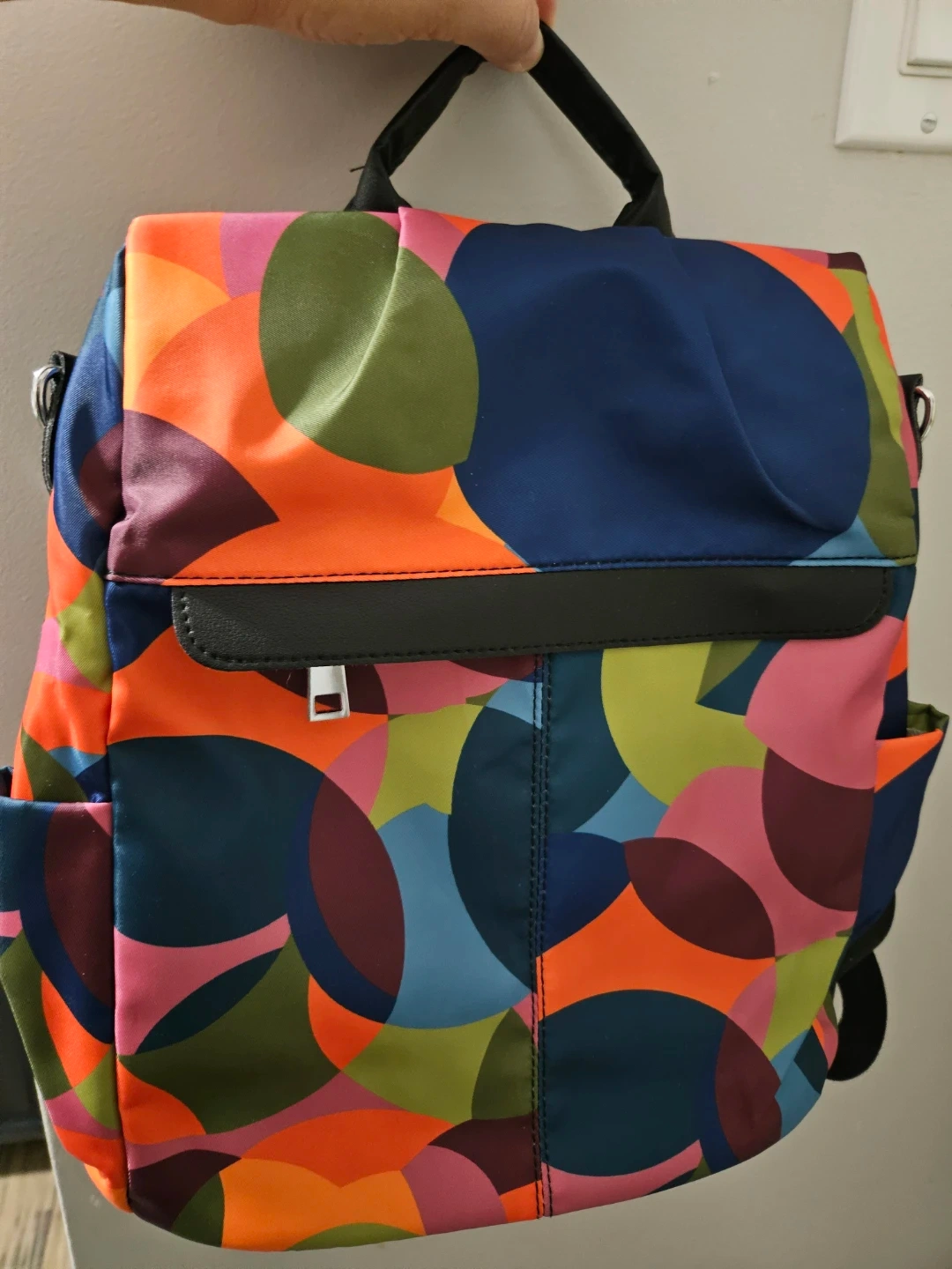 This backpack features a vibrant, colourful geometric pattern. It's made from durable fabric with black faux leather accents. Multiple pockets and adjustable straps for comfort.