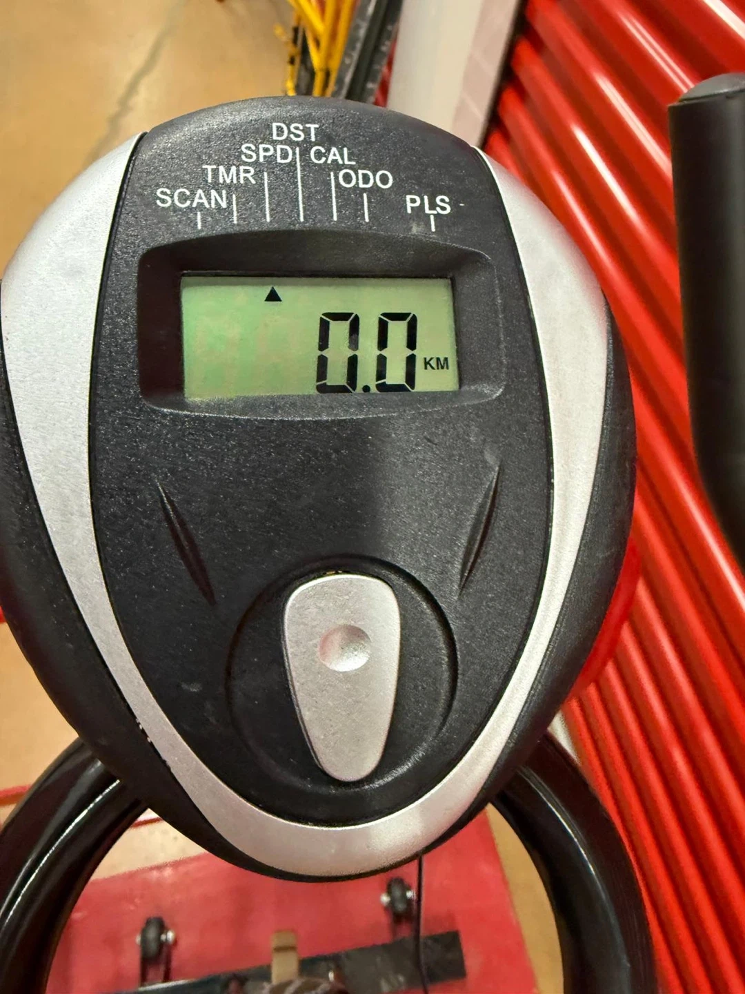 This is an Xtionaland Sport spin bike. It features a digital display for tracking speed, distance, and time. The resistance is adjustable with a red knob. It comes with a water bottle holder.