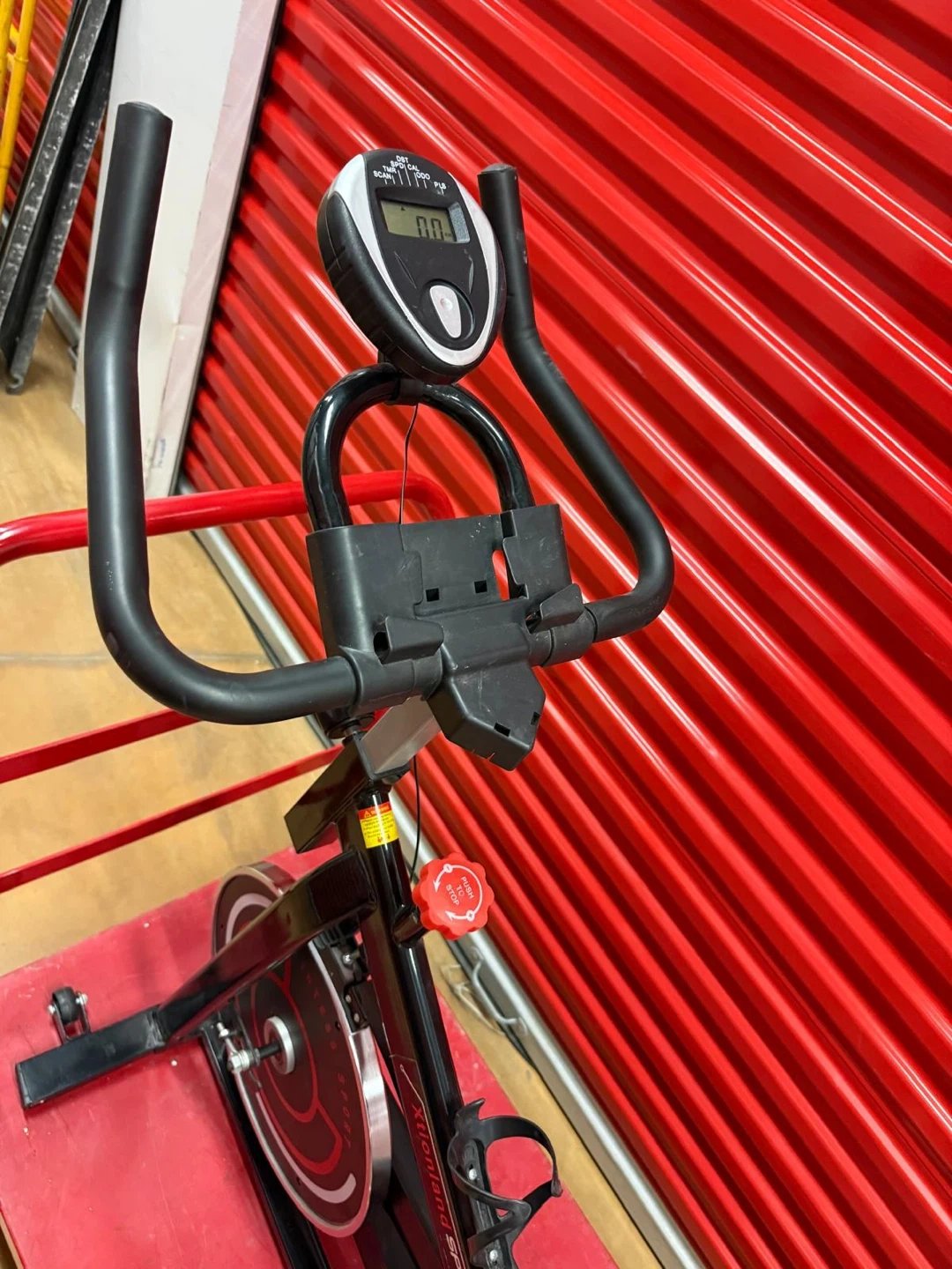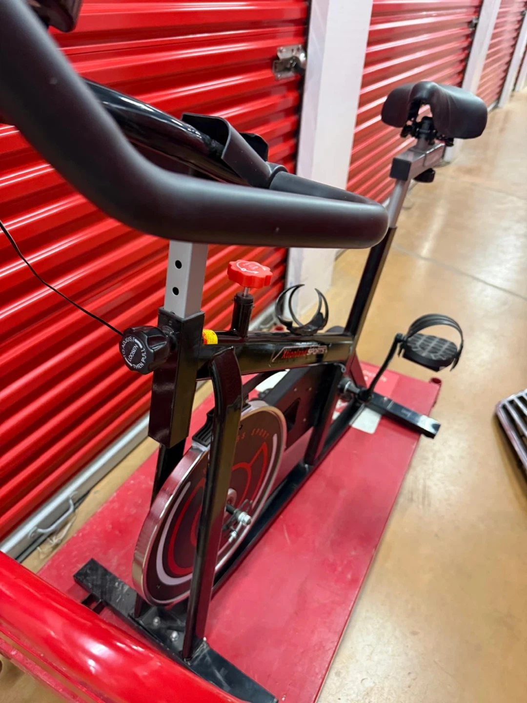 This is an Xtionaland Sport spin bike. It features a digital display for tracking speed, distance, and time. The resistance is adjustable with a red knob. It comes with a water bottle holder.