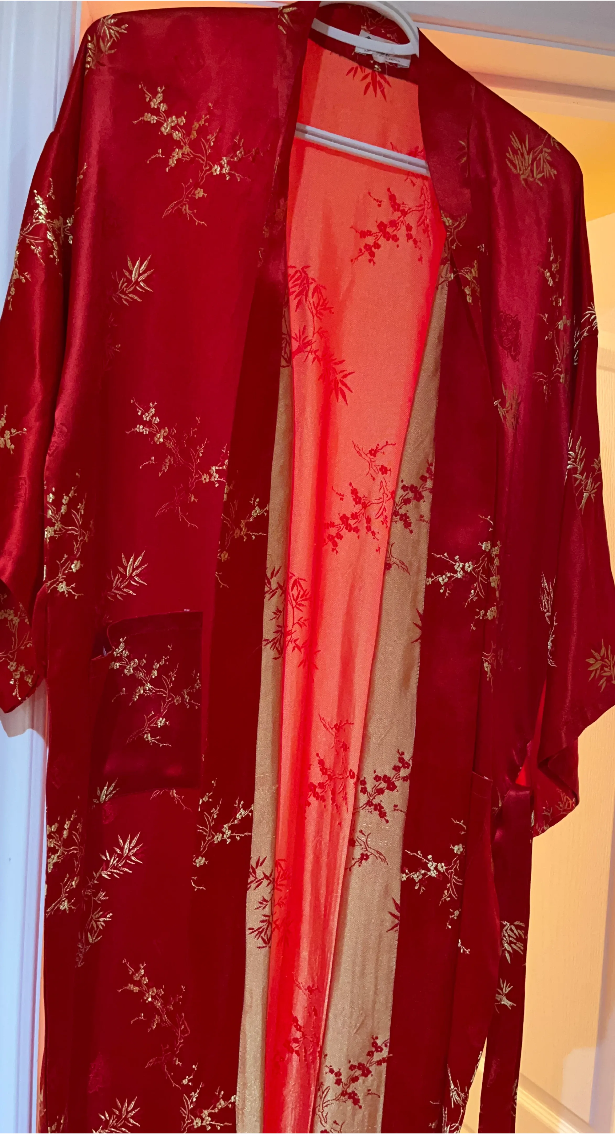 Beautiful red kimono robe with a lovely floral print! Perfect for lounging around the house or adding a touch of elegance to your outfit. The material feels silky and smooth, making it super comfy to wear
