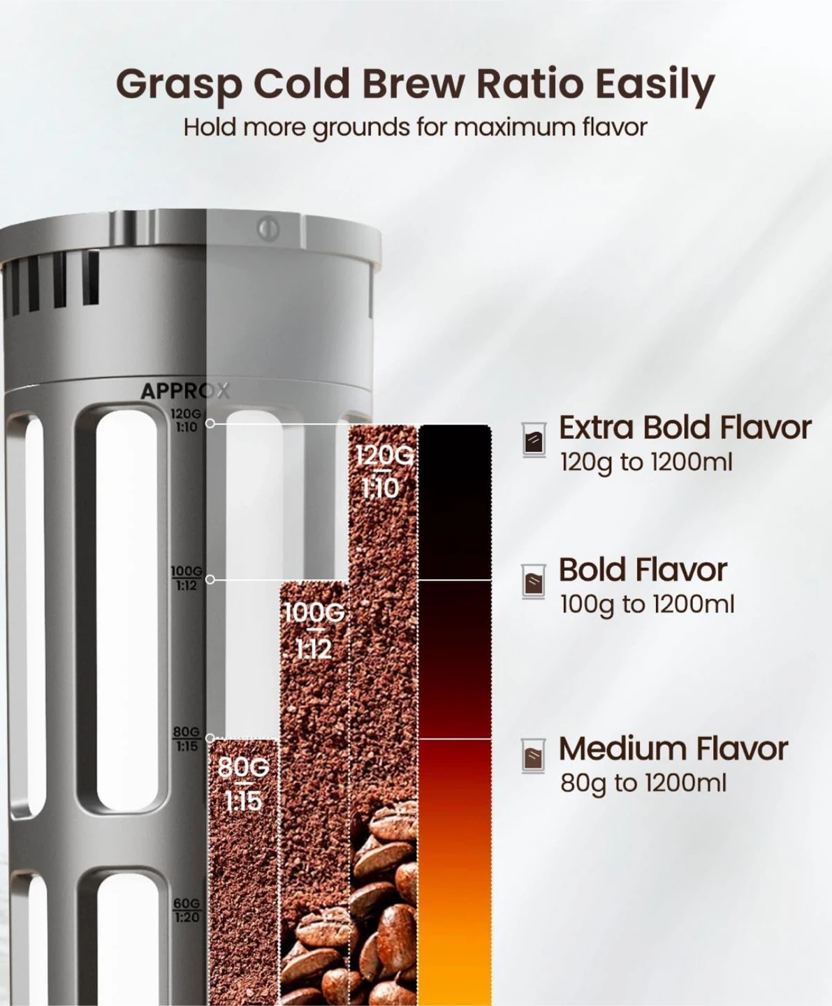 • Cold Brew Ratio Control: Allows for customized coffee strength by adjusting the coffee-to-water ratio.