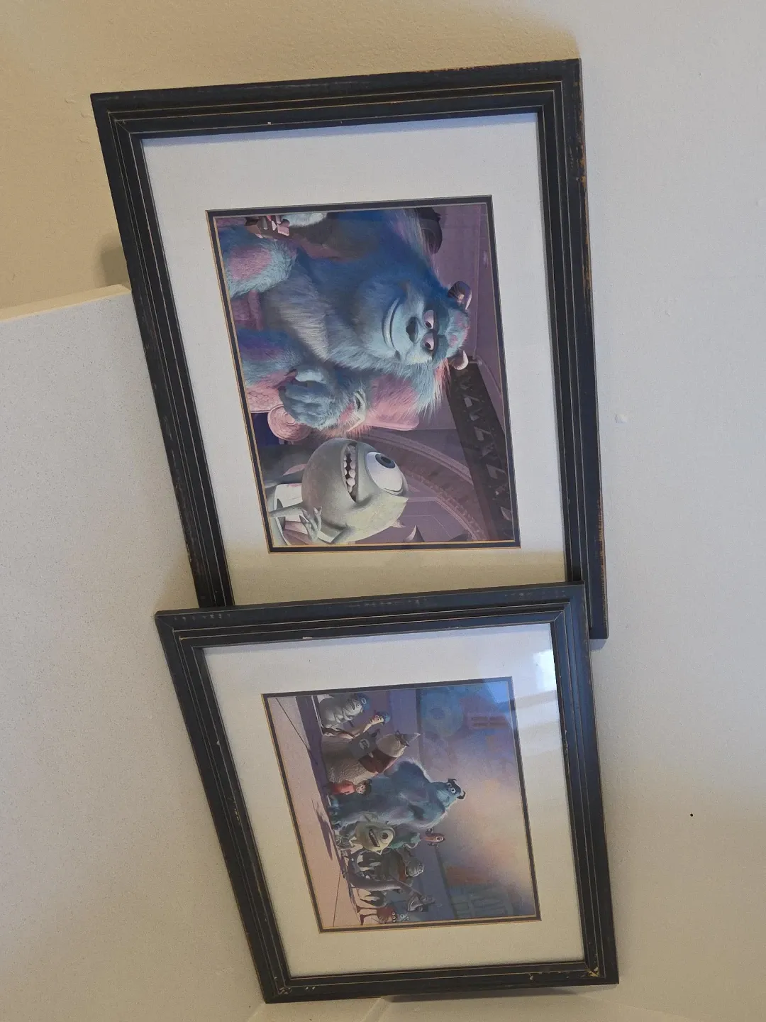 Selling two framed art prints featuring characters from Monsters, Inc. They're in great condition and would look fantastic in a kid's room or any Disney fan's collection!