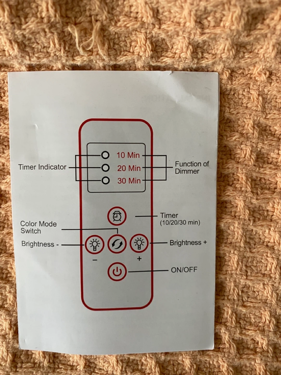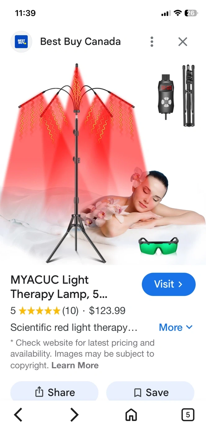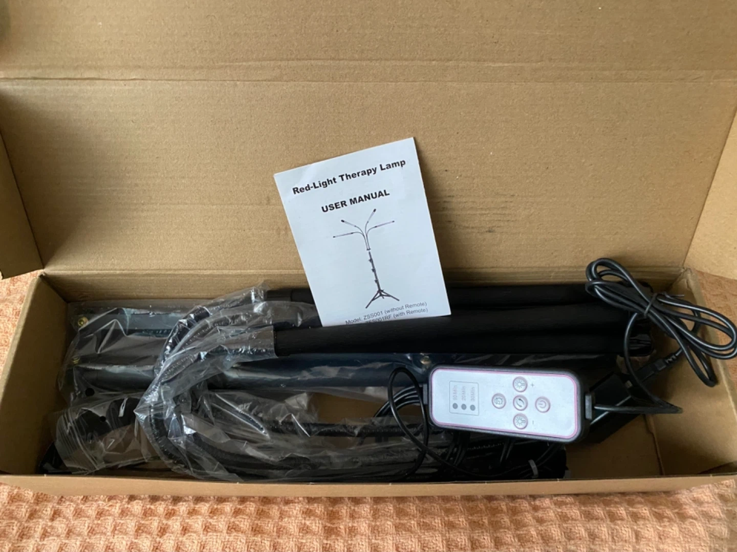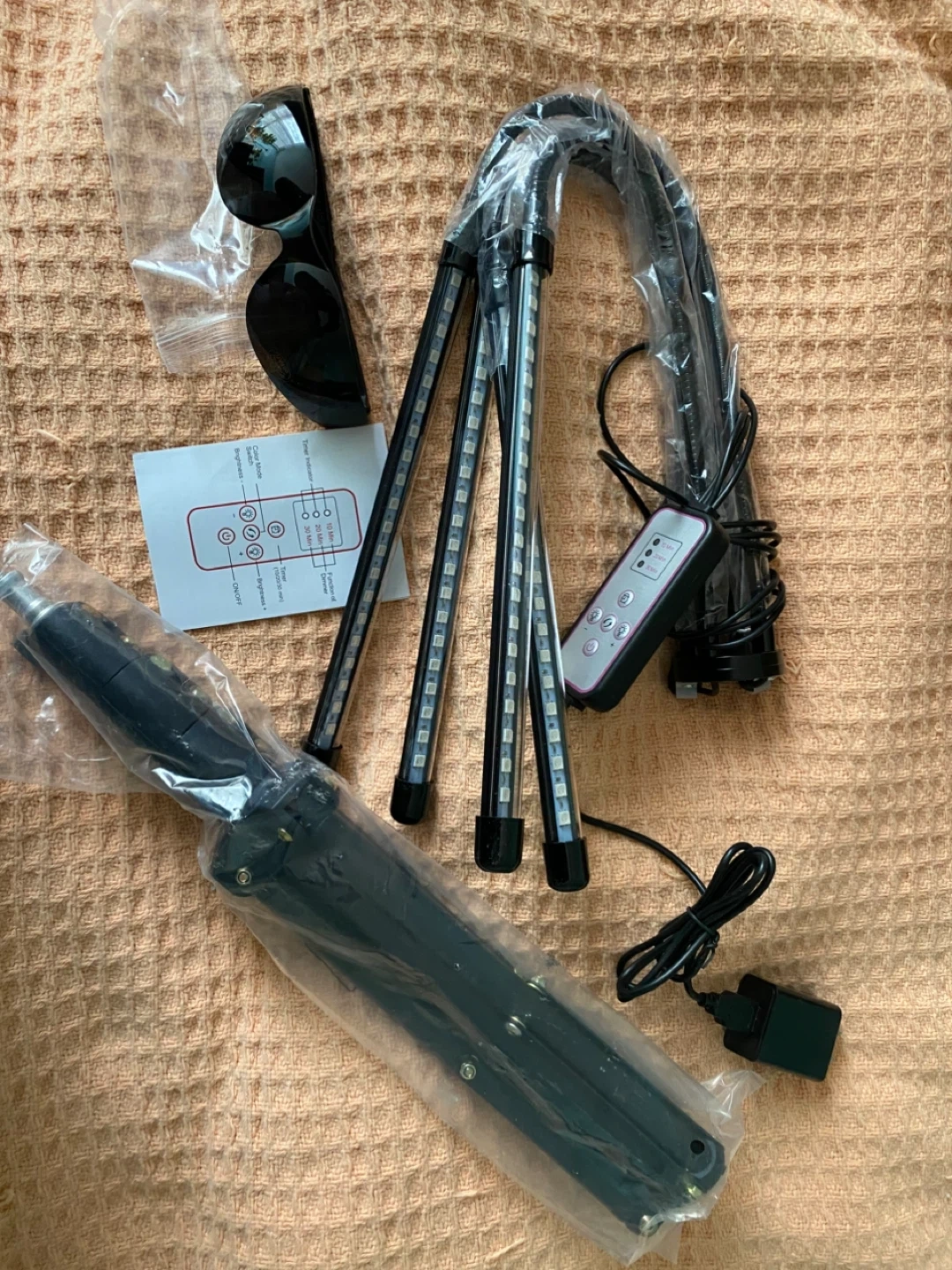 Selling a red-light therapy lamp, comes with a remote and user manual. The lamp has a timer function with settings and also has brightness controls. It also comes with sunglasses to protect your eyes while using it