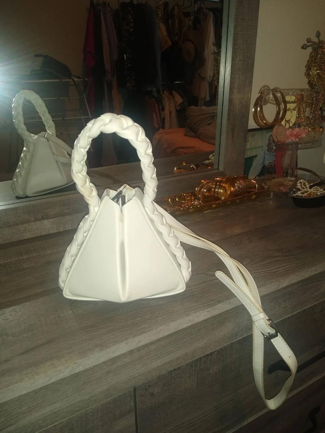 Stylish white geometric handbag with braided top handles and a detachable shoulder strap. It's made of a faux leather material and has a unique pyramid shape. Perfect for a night out or adding a pop to your everyday look!