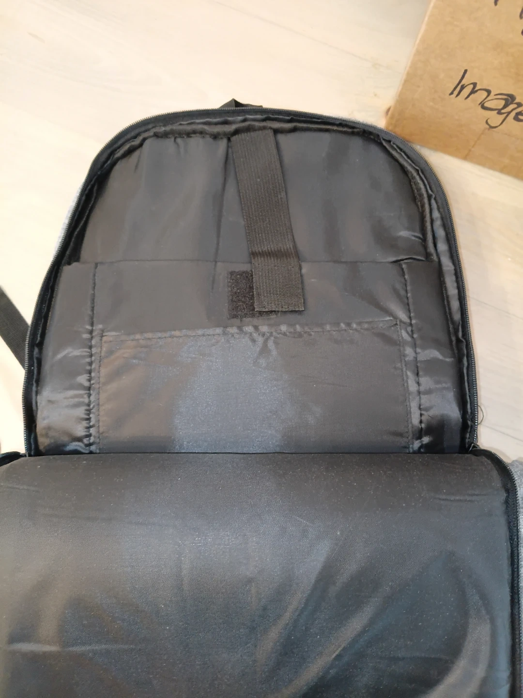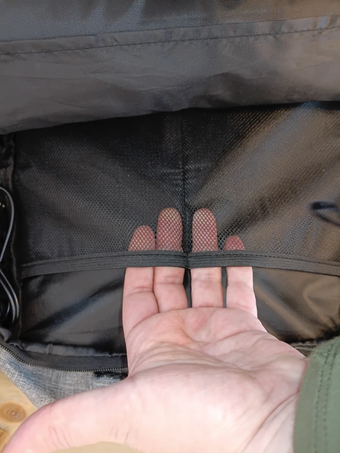 This grey laptop backpack features a spacious main compartment and multiple organizational pockets. (3 main compartments, each with own pockets)