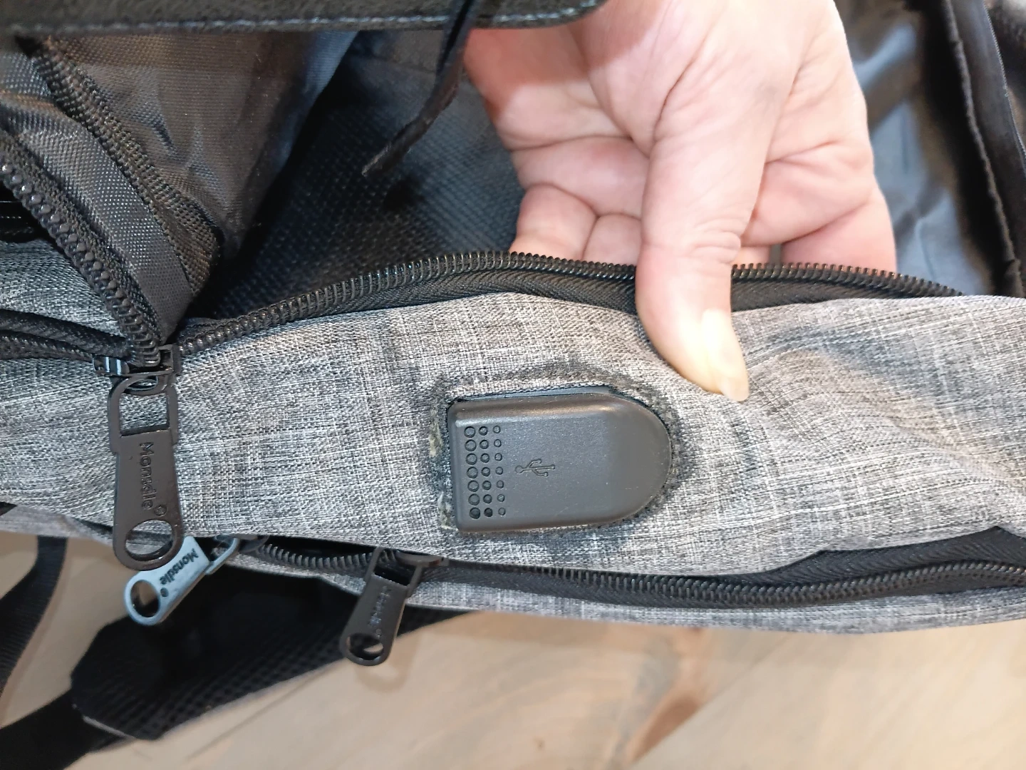 It includes a built-in USB charging port for convenience on the go. The durable fabric construction ensures it can handle daily use.