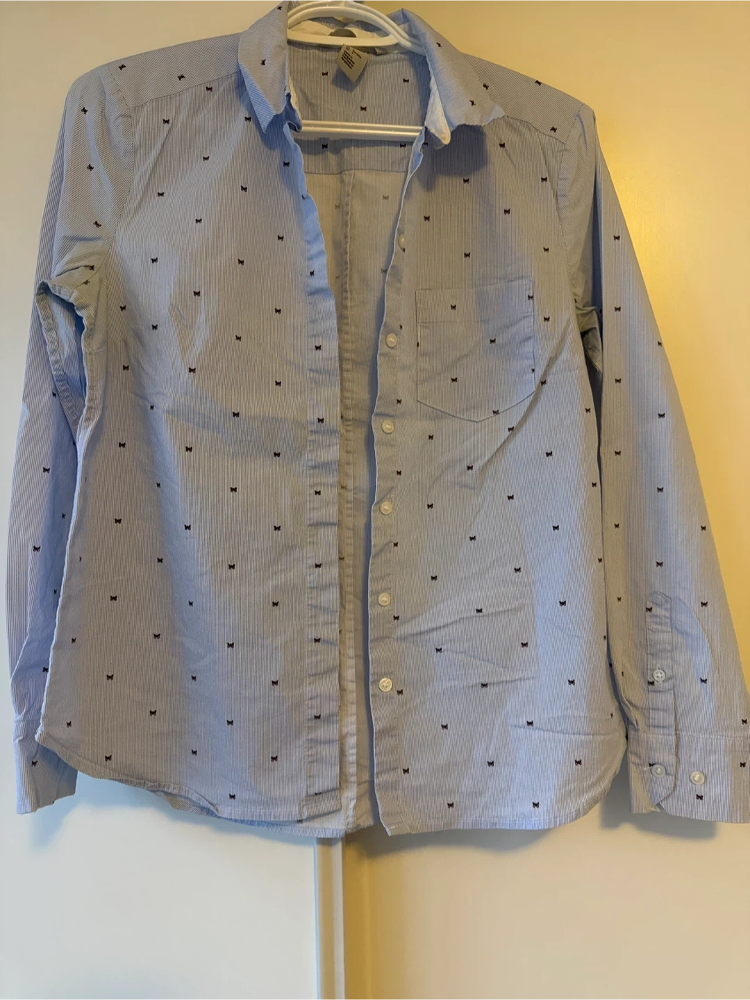This is a cute button-down shirt with a light blue and white striped pattern and a small butterfly print. It's in great condition and perfect for a casual look!