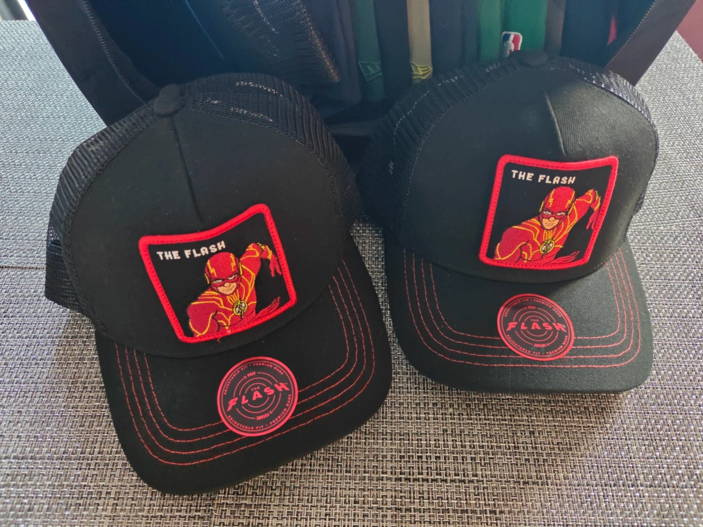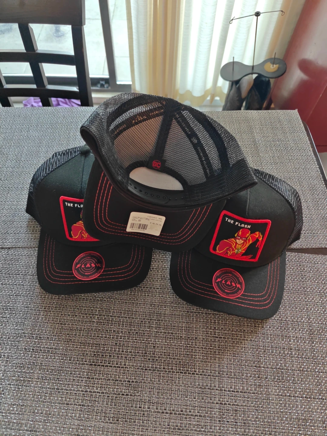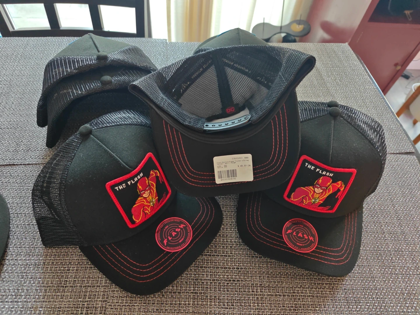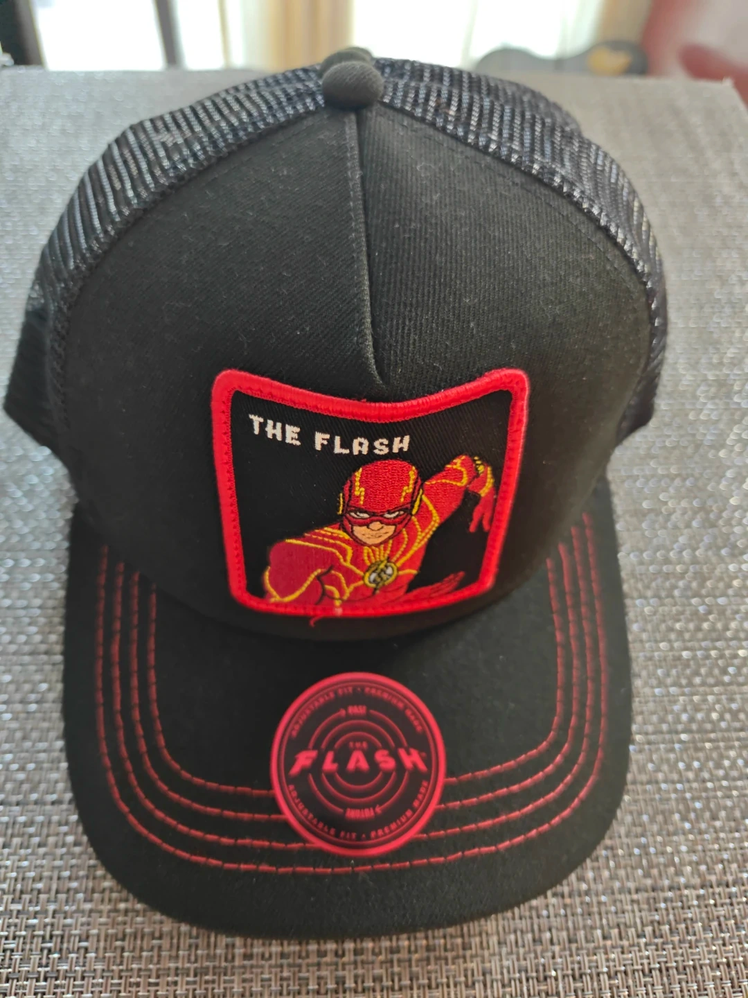 These collectible DC comic THE FLASH, black trucker hats feature a vibrant red embroidered patch. They're designed with a mesh back for breathability and adjustable strap AKA snapback. These hats have never been worn as you can see stored in a storage bag and I currently have four available. Make me an offer