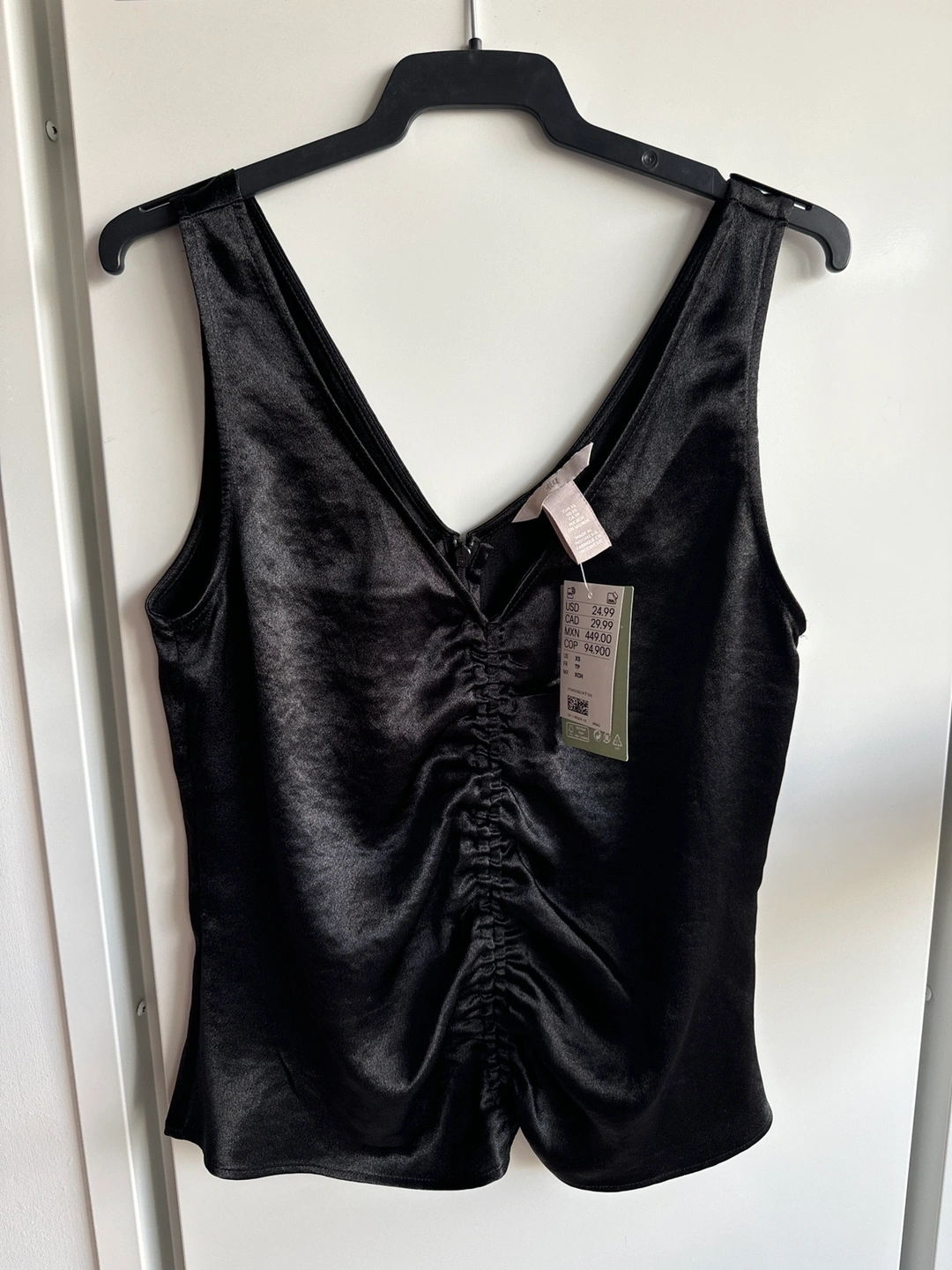 A black satin tank top with a v-neck and a gathered bodice. It is a size medium and has a back zipper closure. The tank top is new with tags. It's a great addition to your wardrobe.